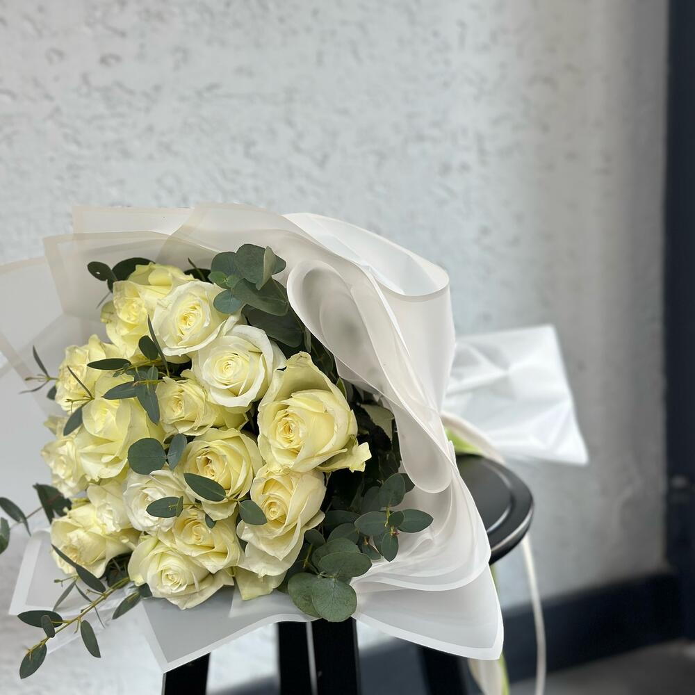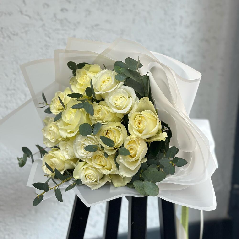 Bu muhteşem çiçek buketi, 15 adet romantik gül ve 15 adet ferahlatıcı okaliptus dalı ile şık ve zarif bir kompozisyon oluşturmaktadır. Hem sevdiklerinize hem de yaşam alanlarınıza büyüleyici bir dokunuş katacak bu buket, özel günlerinizde ve her gün sizin yanınızda olacak. Zarif bir armağan veya ev dekorasyonu olarak mükemmeldir. Aşkınızı veya dostluğunuzu ifade etmenin en güzel yolu olan bu çiçek buketi, sevdiklerinizin yüzünde kesinlikle bir gülümseme yaratacaktır.