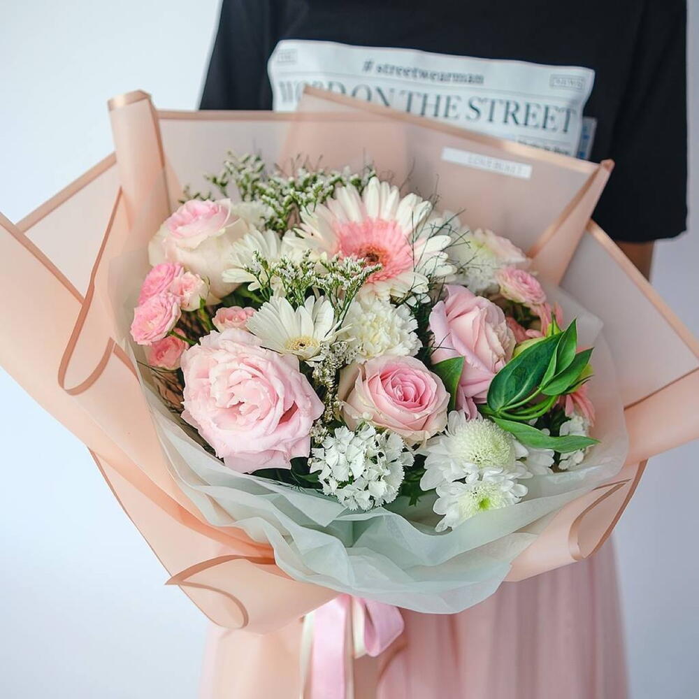 Ruscus - 1 adet Limonium - 2 adet Gerbera - 4 adet rose - 4 adet carnation - 1 adet krizantem çalısı - 2 adet spray roses - 2 adet