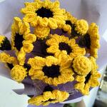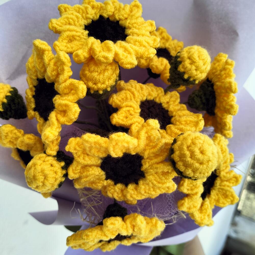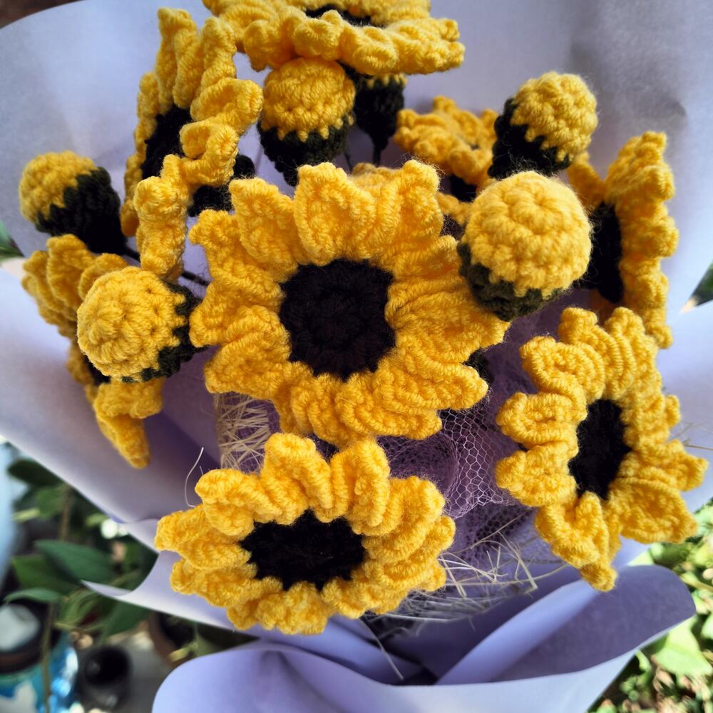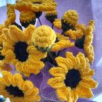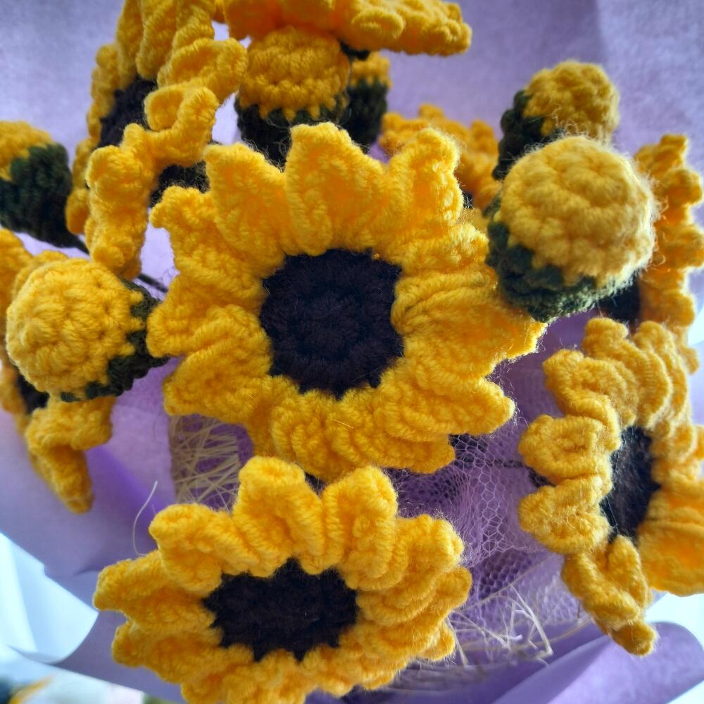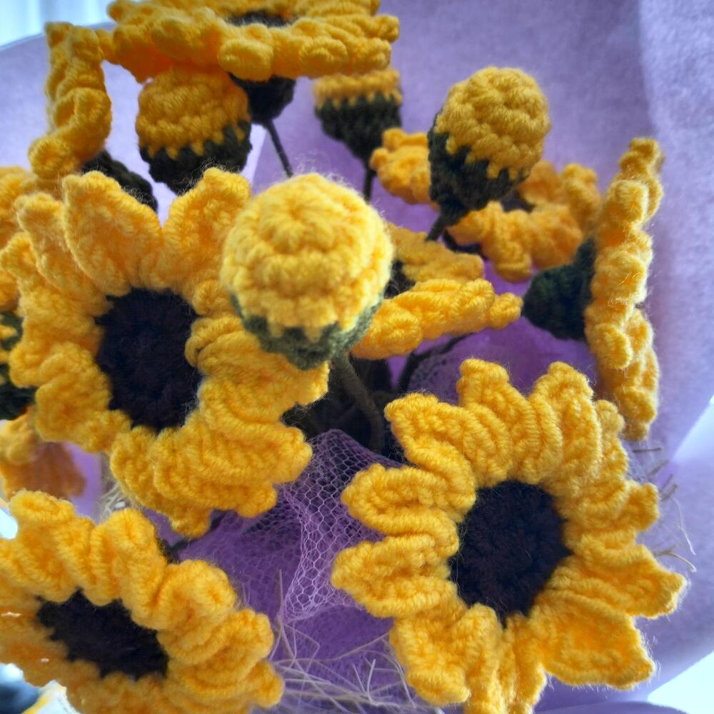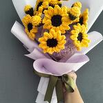 Knitted with Coton yarn. İn the BOUQUET 3 PCS multihead mini sunflower with bud leaves(3 sunflower, 2 bud, 2 leaves on the 1 branch)