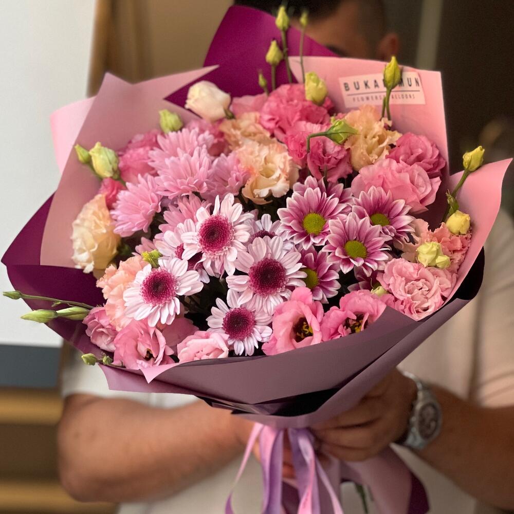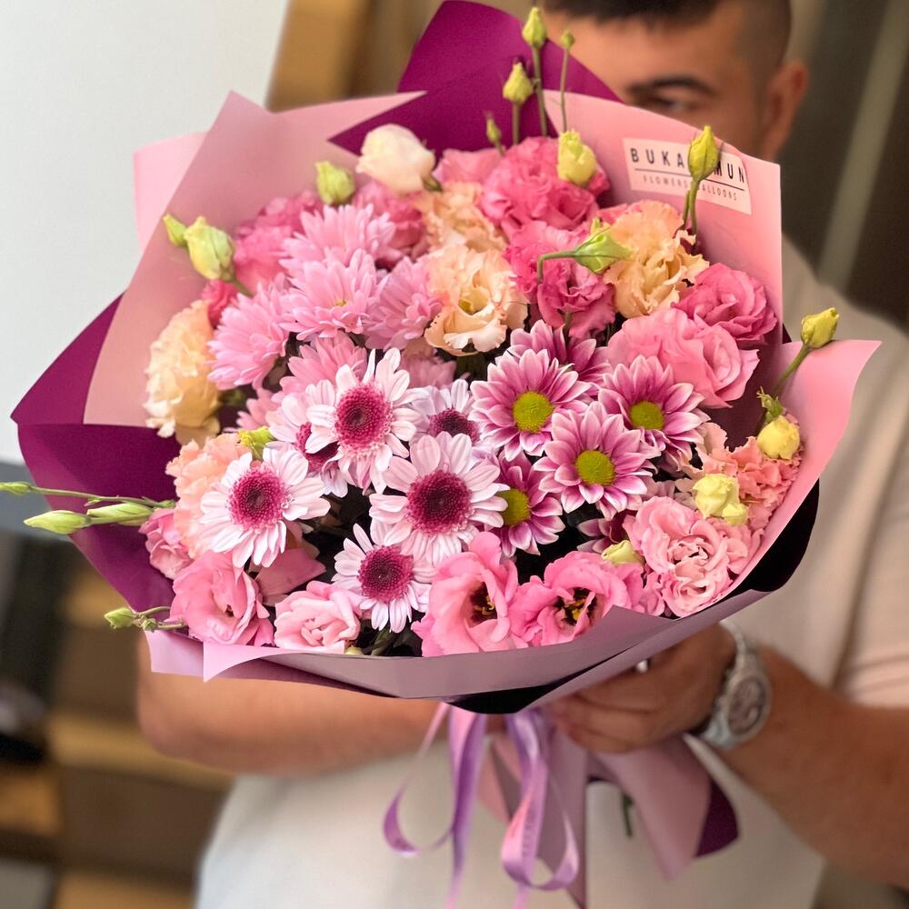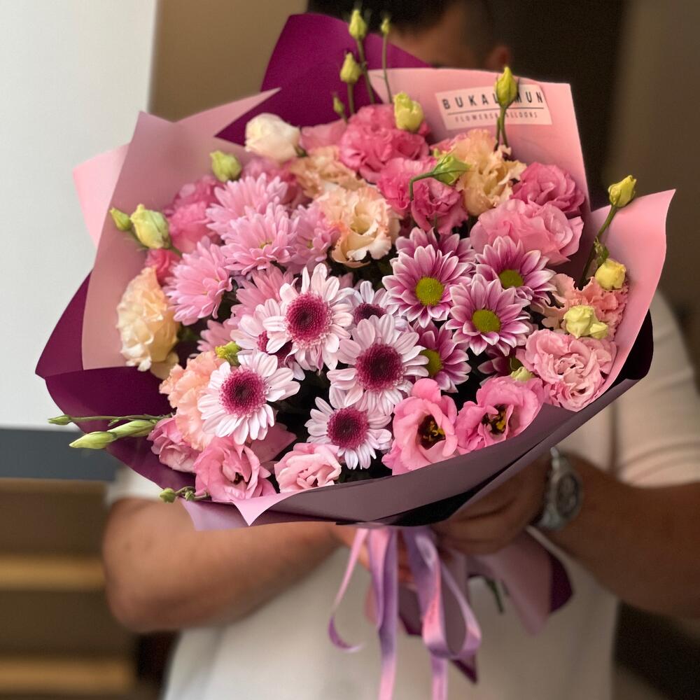 Krizantem ve eustomalar dan oluşan mix buket