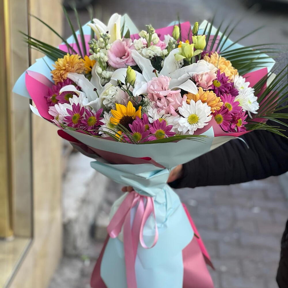 Bu göz alıcı Karışık Buket, ayrıcalıklı bir damak tadı olanlara hitap etmektedir. Dört adet zarif Lisianthus, on beş adet narin papatya ve dört adet ayçiçeği ile zenginleşmiş bir görüntü sunar. Her biri özenle seçilmiş dört adet şebboy ve bir adet kazablanka ona final dokunuşunu ekler. Bu buket, sevdiklerinize neşe ve pozitif enerji getirecek. Hak ettiğiniz kalite ve zarafeti sunan bu buket ile evinizi veya ofisinizi süsleyin!