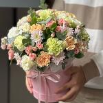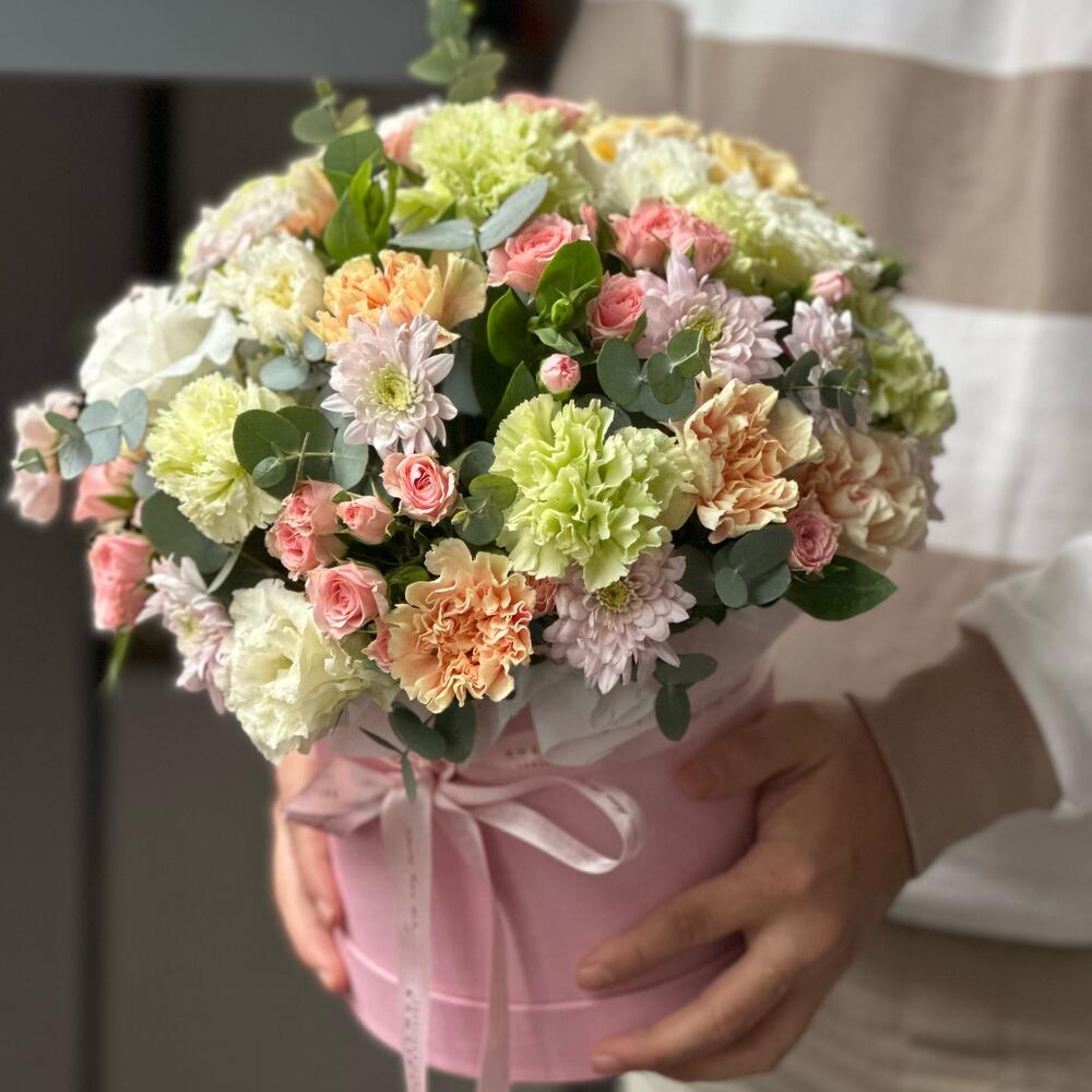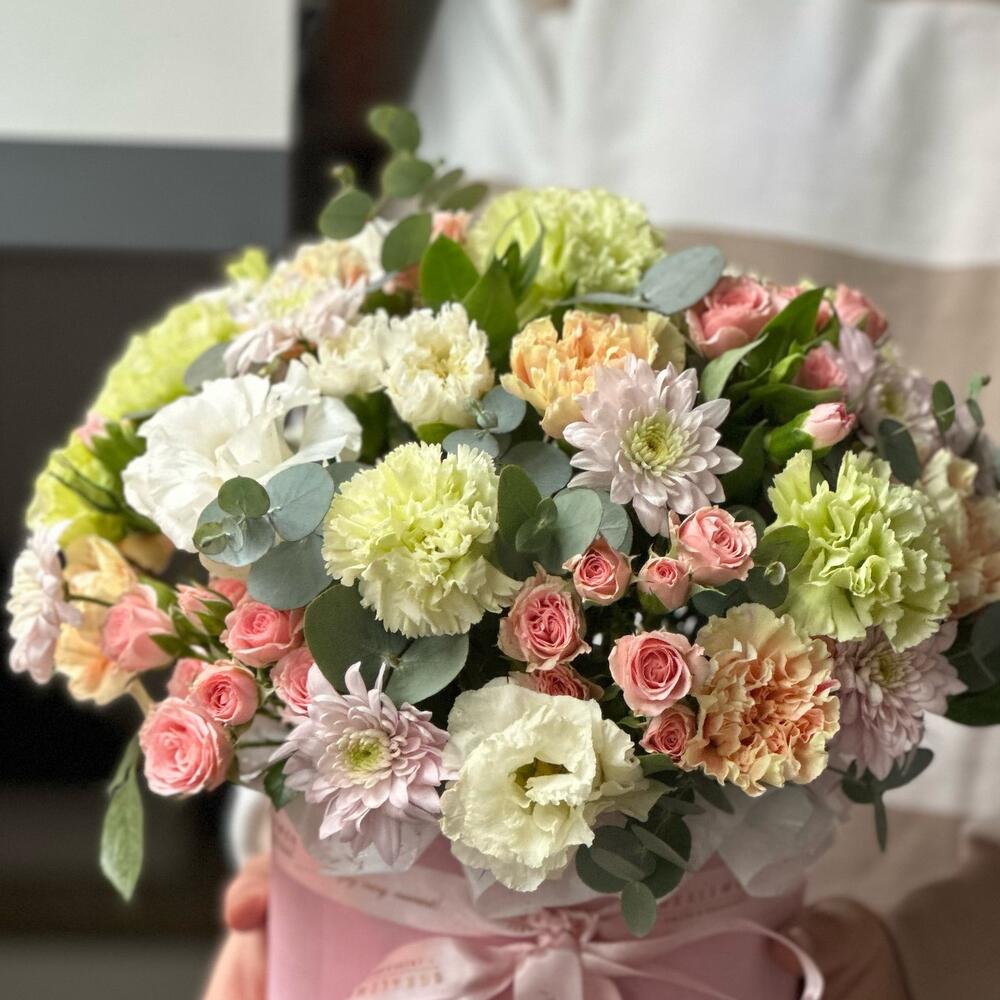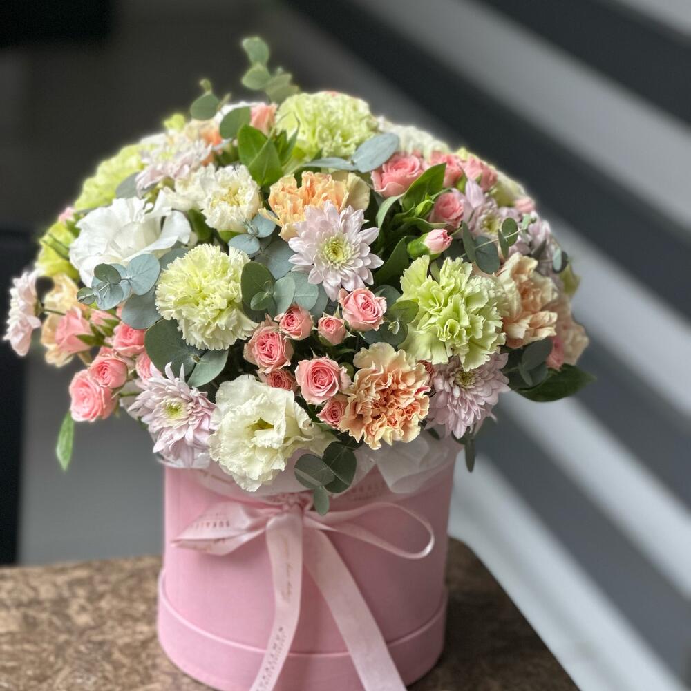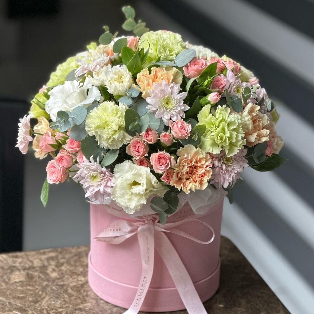 Dianthus okaliptus chrisantem eustoma ve spray güllerden oluşan açık pembe tonlarında kutu.