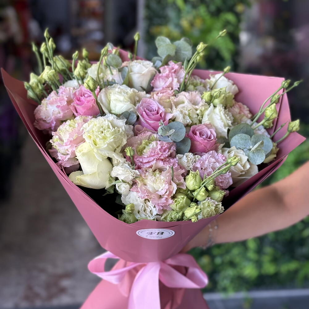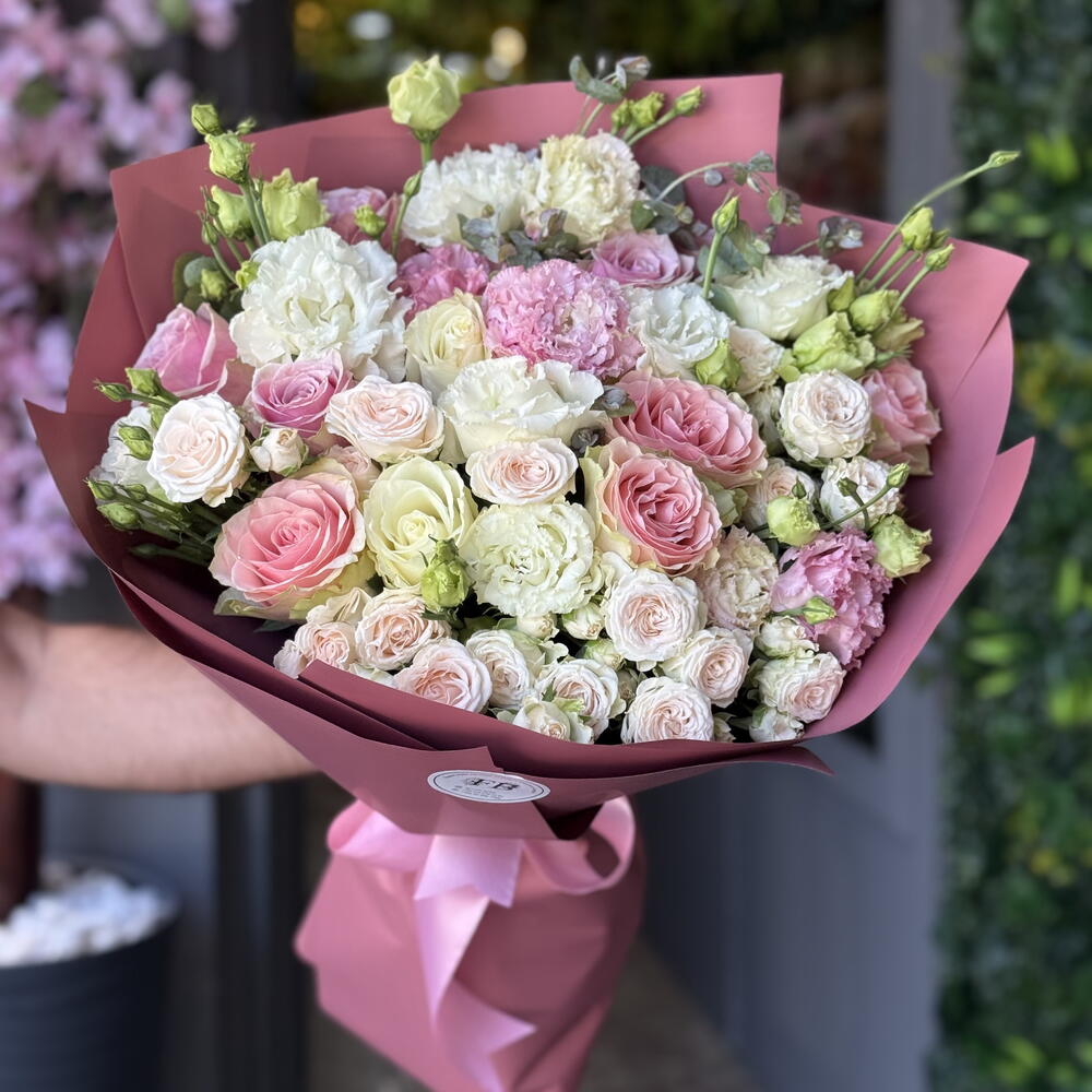 lisyantus - 7 adet roses - 11 adet roses white - 5 adet kustova roz pink - 5 adet roses cream - 3 adet