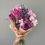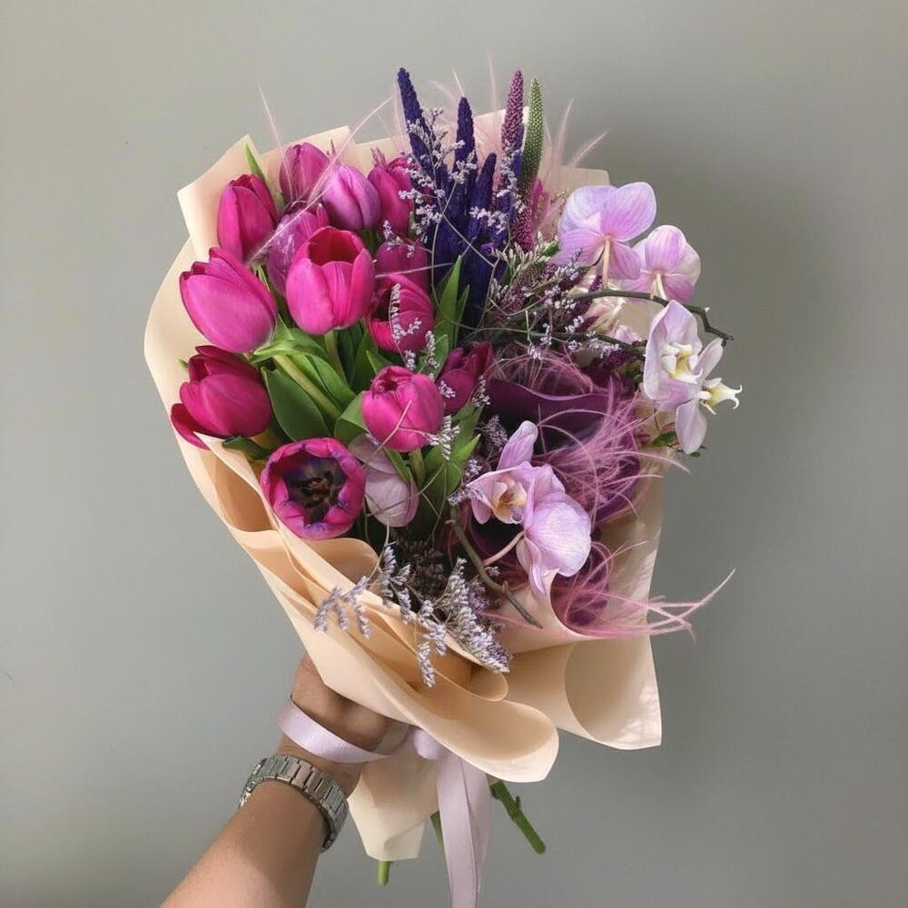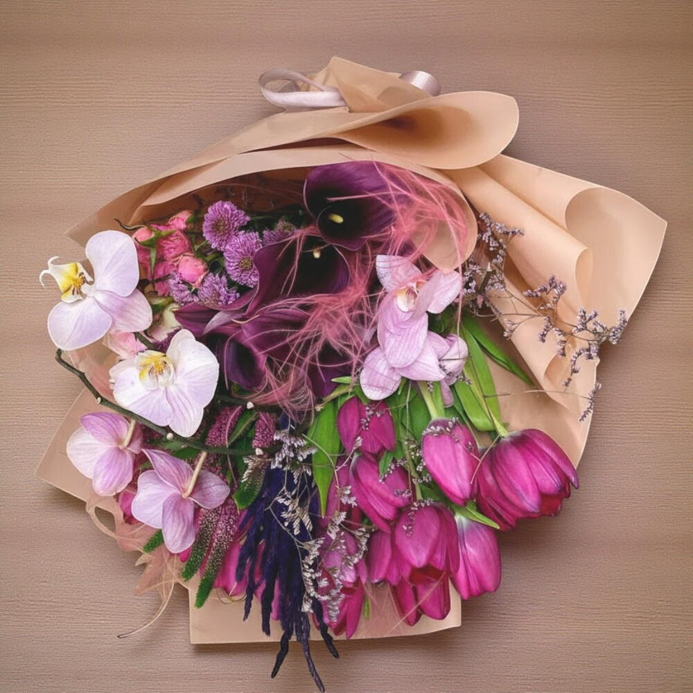 Muhteşem mor ve pembe tonlarının buluştuğu bu göz alıcı buket, zarafet ve asaletin simgesi. Laleler, orkide, lavanta ve kuru çiçeklerin benzersiz kombinasyonu, sevdiklerinize unutulmaz bir hediye sunmanızı sağlar. Doğal dokusu ve romantik havası, özel günler, kutlamalar ve sürprizler için harika bir seçenektir. Çiçekleri doğrudan güneş ışığından koruyarak serin bir ortamda saklayın. Vazo suyunu her gün değiştirerek çiçeklerin tazeliğini koruyun. Solan yaprakları ve çiçekleri düzenli olarak temizleyin. Sapları her 2-3 günde bir keserek daha iyi su almasını sağlayabilirsiniz.