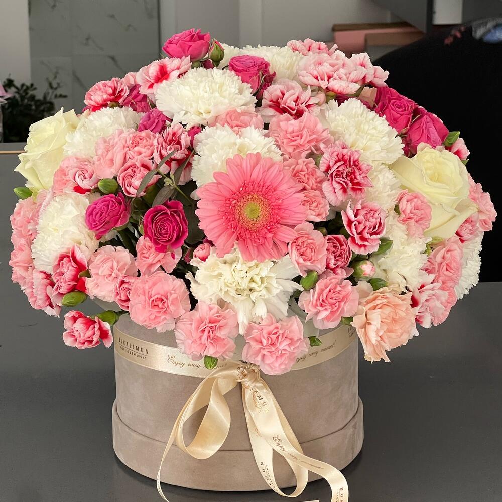 Silindir kutu içerisinde kompozisyon. Kutunun rengi değişiklik gösterebilir pembe - beyaz olabilir