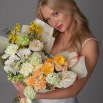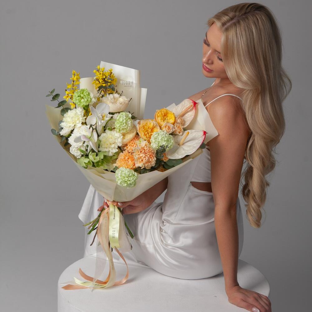 Bu muhteşem buket, ışık ve gölgenin oyunuyla yumuşak şeftali tonlu bir aura yaratan bir ilkbahar bahçesine davet gibi hissettiriyor. Çiçek açan tomurcukları andıran şakayık gülleri incelik ve tazelik yayarken, forsitya dalları canlı yeşil yaprakları ve zarif çiçekleriyle kompozisyonu canlandırır. Orkideler gizem ve zarafet katarken, karanfiller hafif bir koku katar ve bu büyüleyici ilkbahar buketinin pastel paletini tamamlar.