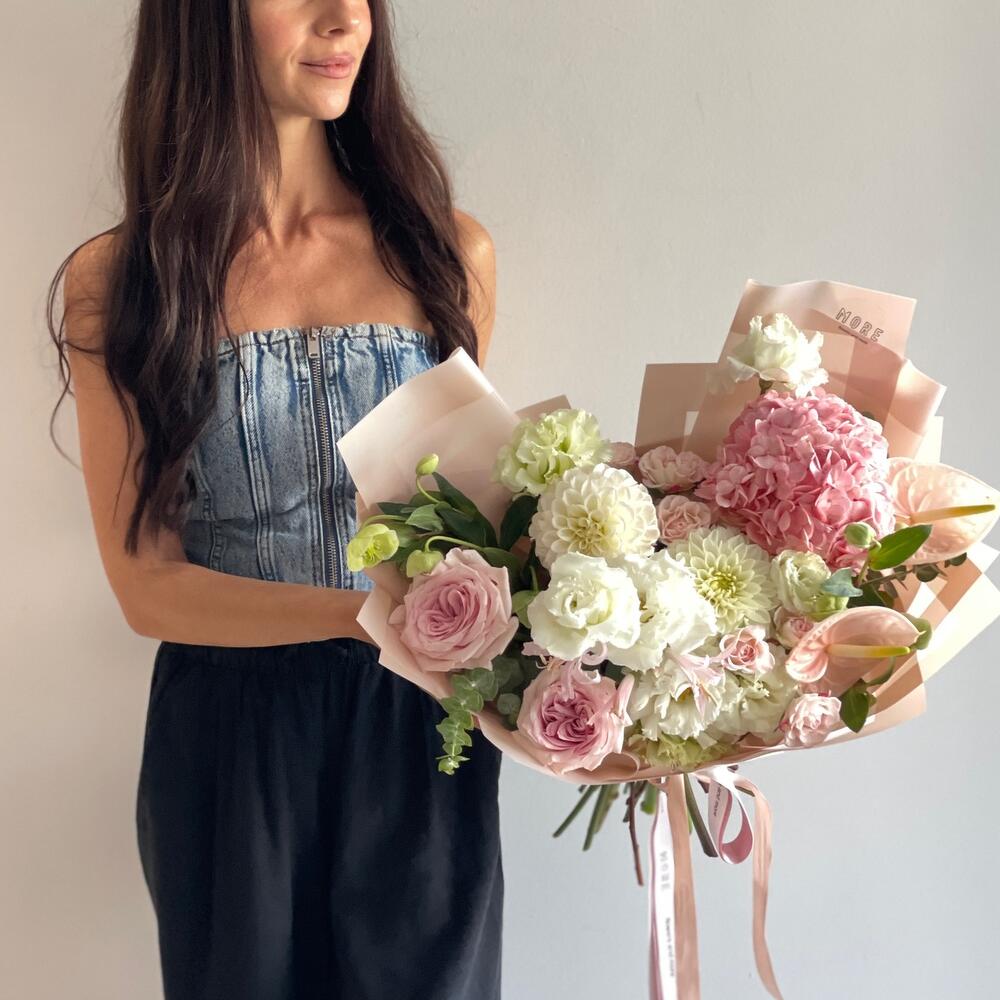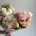 Bu şık buket, zarafet ve cazibenin mükemmel bir ifadesidir ve her türlü özel anı gerçekten özel kılmak için idealdir. Yumuşak pembe tonlarında iki lüks şakayık gül ile başlayarak, uyumlu tonlarda yedi nazik küçük gül demetini tamamlar. Ortancaların nazik renkleri, beş canlı yıldız çiçeği ve beş etkileyici lisyantus ile güzel bir şekilde kontrast oluşturarak sofistike bir dokunuş ekler. Üç egzotik antoryum, bukete benzersiz bir unsur katarken, beş sprey gül buketin karmaşık dokusunu ve uyumunu artırır. Nazik pembe kağıda özenle sarılmış bu buket, şık bir zevk ve içten duyguları ifade eden muhteşem bir hediyedir.