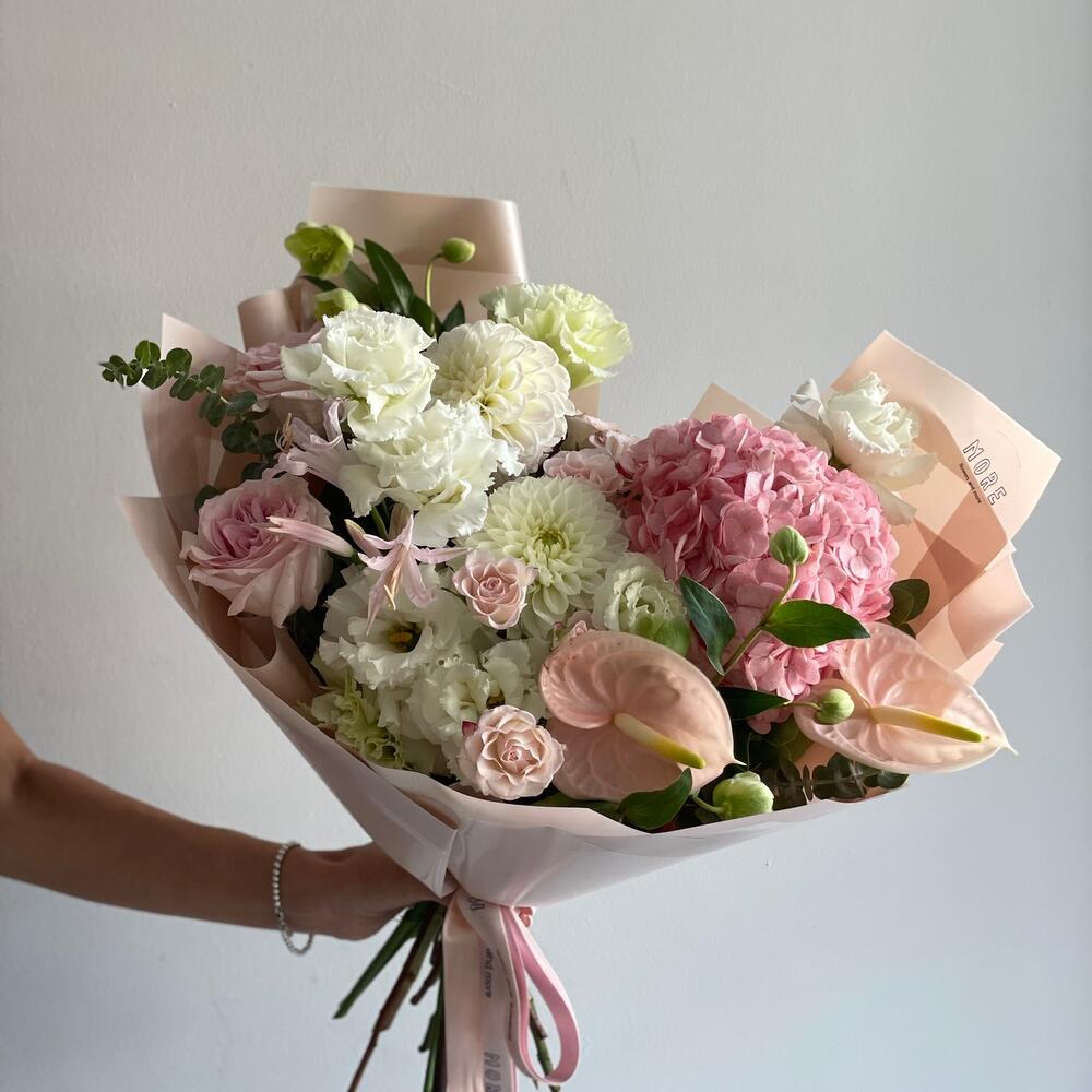 Hydrangea - 1 adet Lisianthus - 3 adet dahlia - 2 adet packing paper - 3 adet noel gülü - 1 adet sprey güller - 2 adet roses pink - 2 adet antoryum - 2 adet