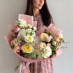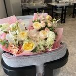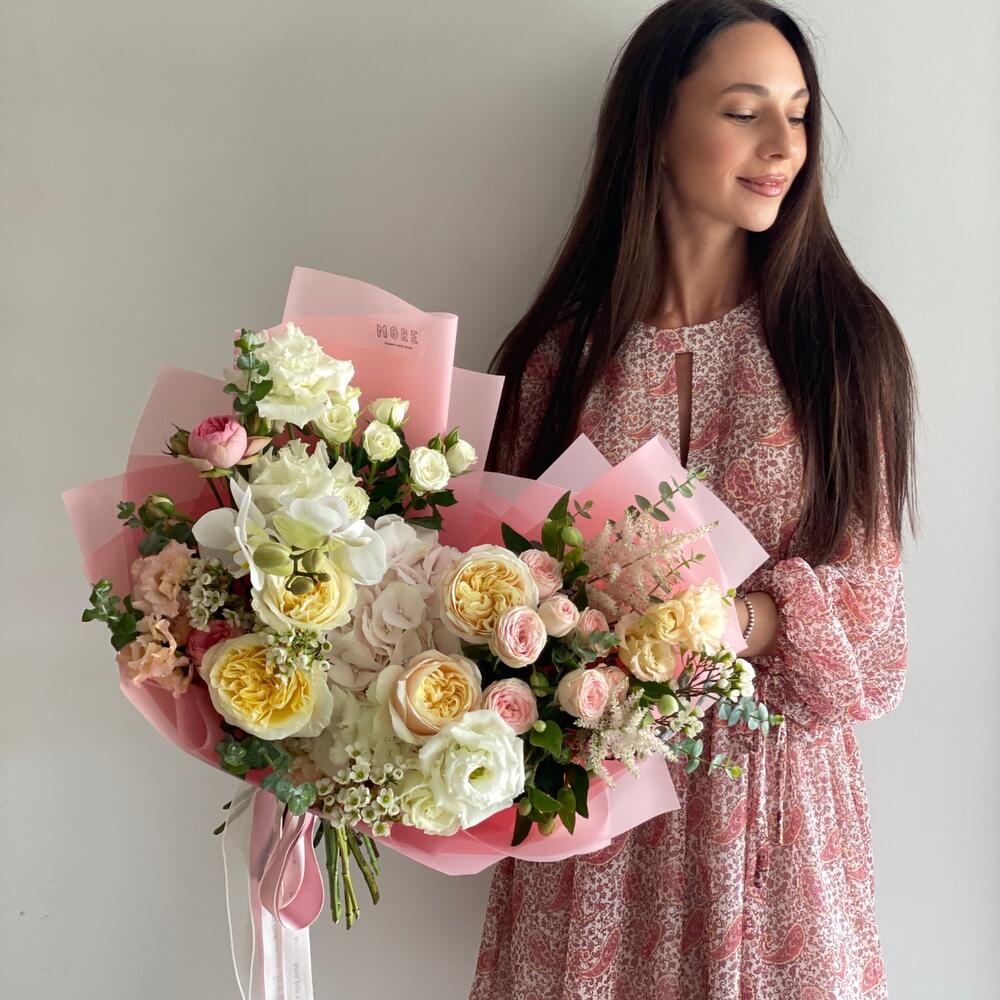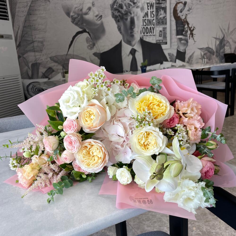 Peony rose - 4 adet Eucalyptus - 2 adet Hydrangea - 1 adet Lisianthus - 3 adet Wax flower - 2 adet Orchid - 1 adet packaging - 3 adet astilbe - 2 adet