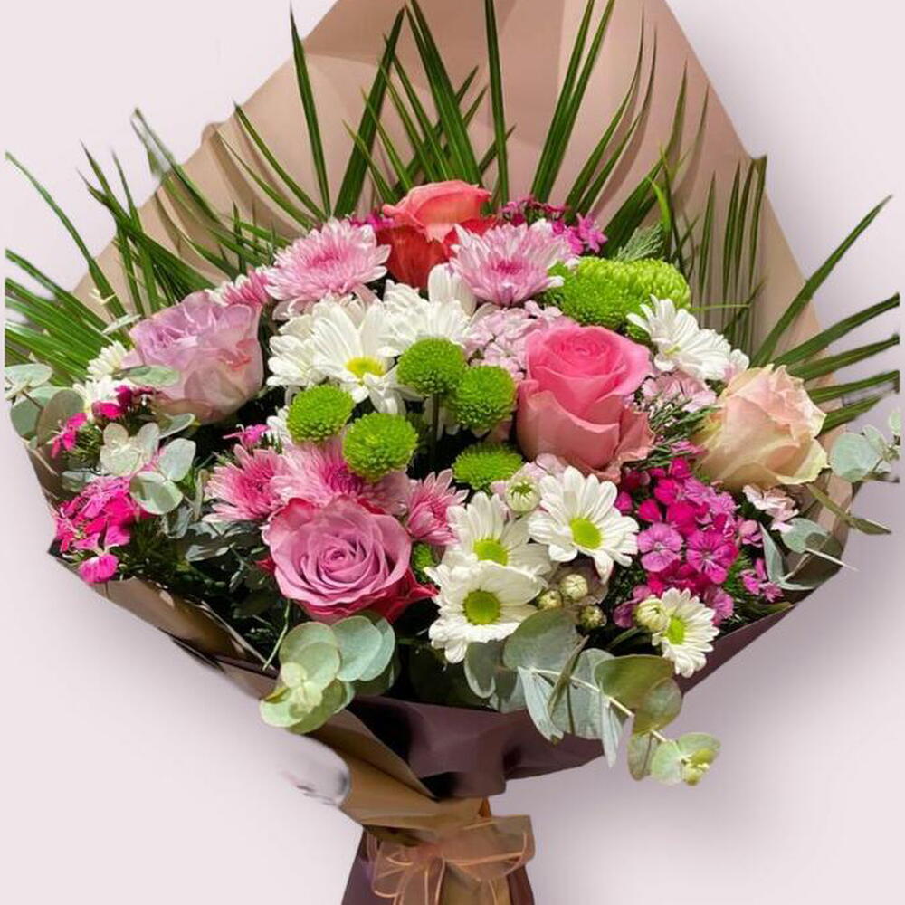 Bu sevimli karışık buket, görkemli beş adet papatya, ferahlatıcı bir yeşillik dokunuşu için bir adet yeşil çiçek, romantizm için beş adet pembe gül, göze çarpan bir ambalaj ve beşer adet pembe ve yeşil çiçekler ile doludur. Eşsiz ve büyüleyici bu buket, sevdiklerinize özel hissettirmek için mükemmel bir hediye. Her bir çiçek özenle seçilmiş ve bu muhteşem kompozisyonu oluşturmak için bir araya getirilmiştir. Özel günlerinizde, sevdiklerinizin yüzünde gülümseme yaratmak için bu şık karışık buketi tercih edin.