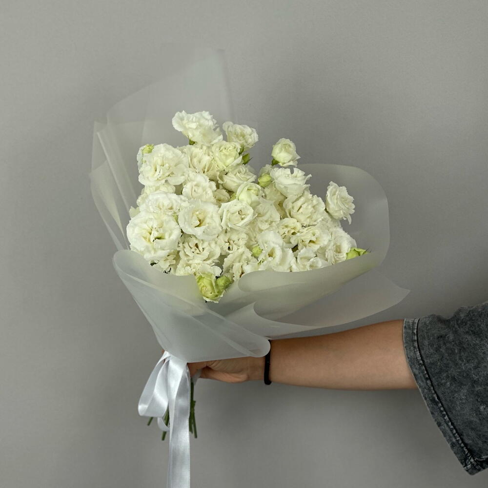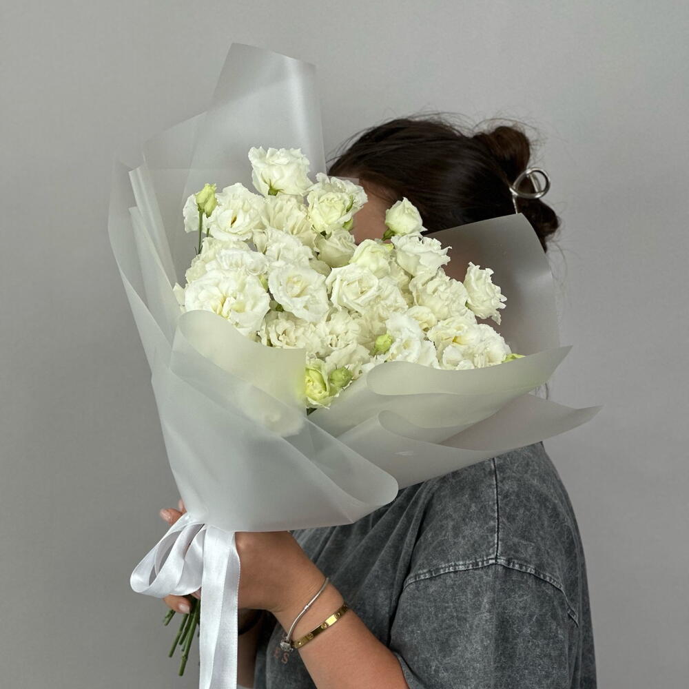 Kar beyazı, beyaz mevsimlik lisianthus çiçeklerinden oluşan buket
