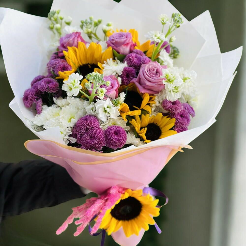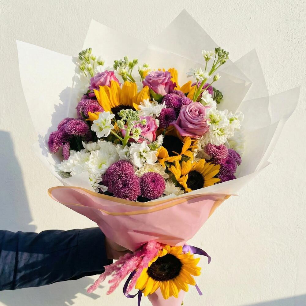 Bu zarif ve göz alıcı karışık buket, doğanın taptaze ve renkli güzelliklerini size sunuyor. 4 adet narin pembe gül, 5 adet parlak sarı ay çiçeği ve 20 adet pembe papatya ile bu buket, romantik ve ferahlatıcı bir atmosfer yaratır. Aynı zamanda, okaliptüs ve virgatus yeşillikleriyle doğallığı ve zarafeti yansıtan bu buket, şebnem ve beyaz/pembe buket kağıtlarıyla tamamlanarak estetik bir görünüm kazanır. Özel günlerinizde, sevdiklerinize olan duygu ve takdirinizi zarif bir şekilde ifade etmek için mükemmel bir hediye seçeneği olacaktır. Buketinizin ömrünü uzatmak için her zaman suyu taze tutmaya özen göstermeli ve doğrudan güneş ışığından uzak tutmalısınız.