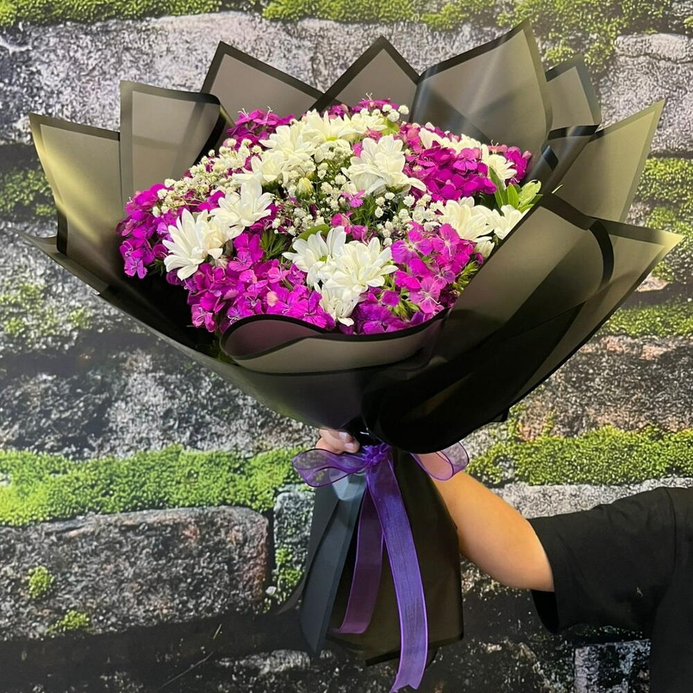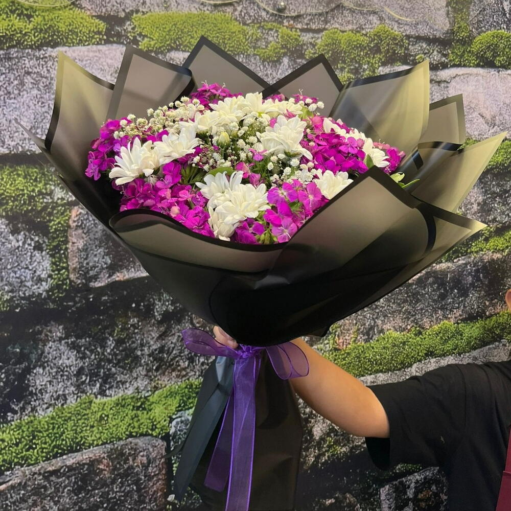 Şıklığın ve zarafetin buluştuğu bu özel buket, mor tonlarındaki hüsnü yusuf çiçekleri ile beyaz papatyaların eşsiz uyumunu yansıtıyor. 🌸 Siyah şeffaf ambalajı ve mor kurdele detayı ile asil, modern ve etkileyici bir duruşa sahip. 🌿 🌼 Büyük boy tasarımıyla özel günlerde, doğum günlerinde ya da “iyi ki varsın” demek istediğiniz her anda mükemmel bir tercih. 🤍 Hüsnü yusuf sevgi ve sadakati, papatyalar ise masumiyet ve içtenliği simgeler. 🎀 Anlamı: Saf duygular, zarafet ve derin sevgi.