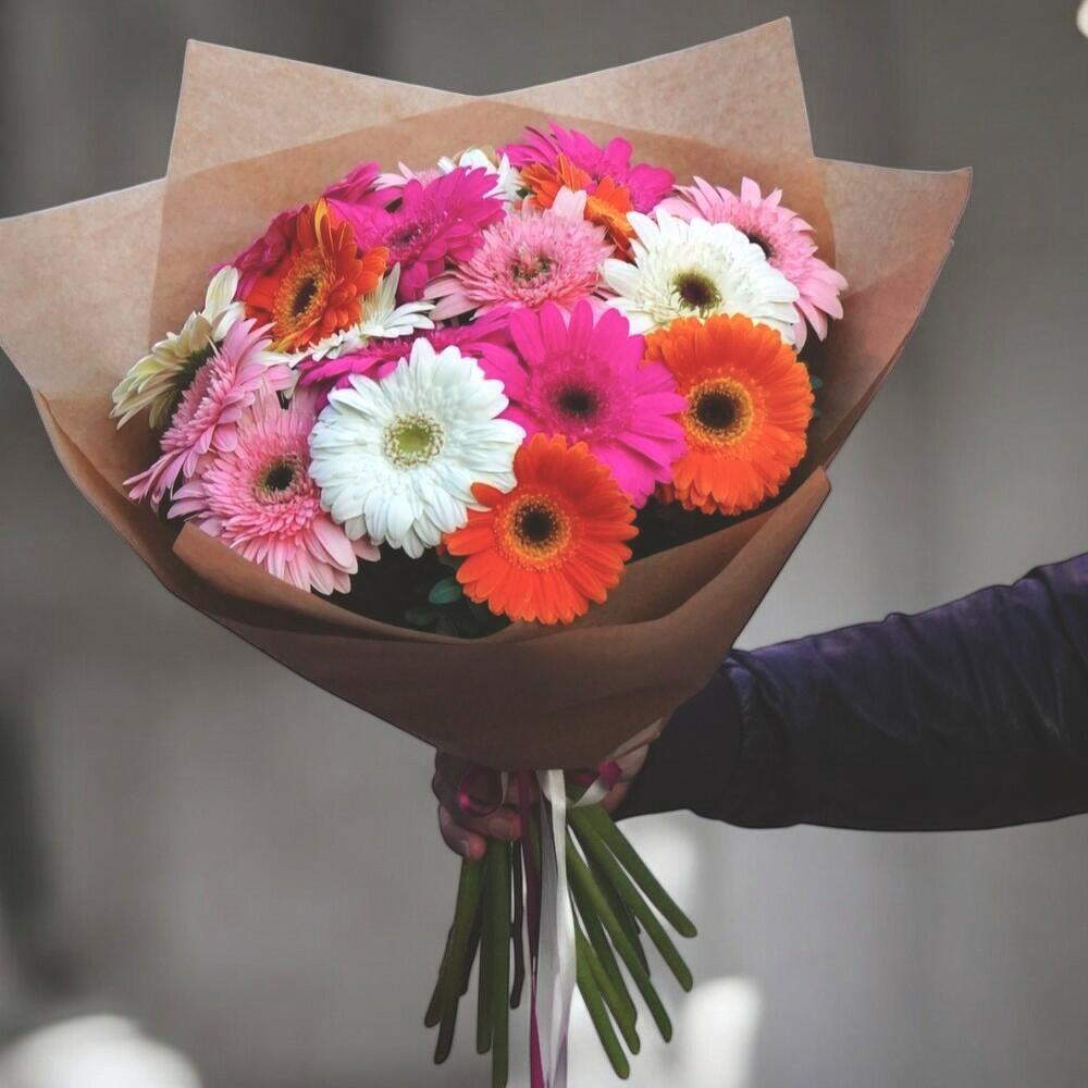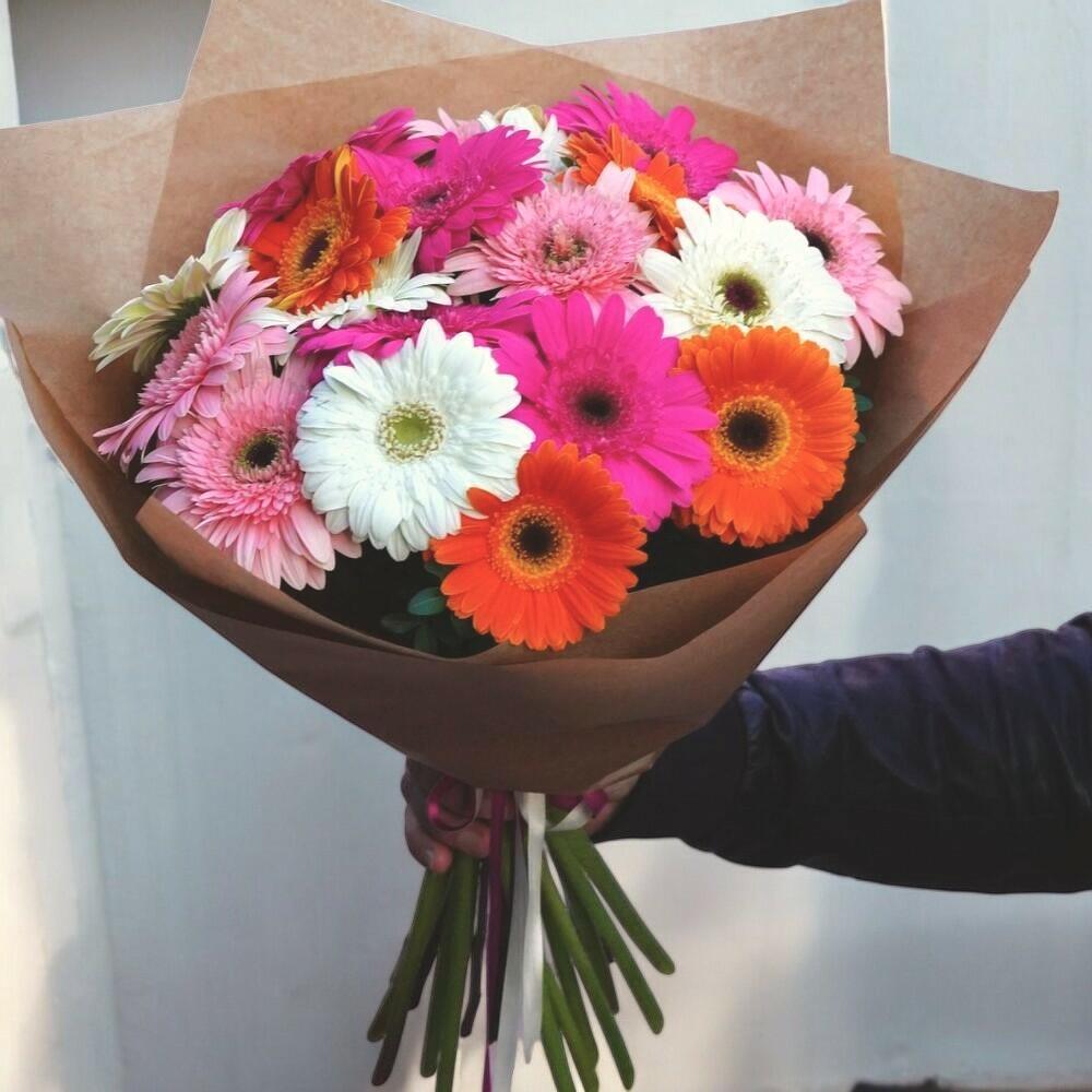 Bu canlı, çok renkli gerbera buketi neşe ve pozitiflikle dolup taşıyor. Her çiçek ateşli turuncudan narin pembelere ve ferah beyaza kadar cesur bir tonu sergileyerek bu aranjmanı doğum günleri, kutlamalar veya sadece birinin gününü aydınlatmak için neşeli bir hediye haline getiriyor. Doğal kraft kağıdına sarılı olarak, renkli ruhunu mükemmel şekilde dengeleyen kırsal bir çekicilik katıyor. Bu çiçekleri taze tutmak için serin suya koyun, sapları iki günde bir açıyla kesin ve yakınlarda doğrudan güneş ışığından kaçının. Gerberalar uzun vazo ömrüyle bilinir ve biraz bakım ile güzelliklerini saçacaklardır.