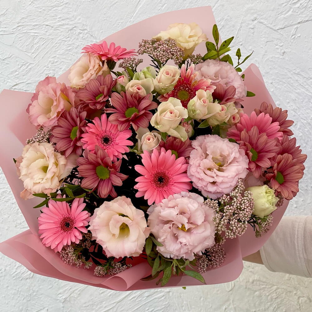 Eustoma - 4 adet gerbera mini - 5 adet bush rose - 1 adet krizantem çalısı - 2 adet osmantus - 2 adet zeytin yeşilliği - 5 adet
