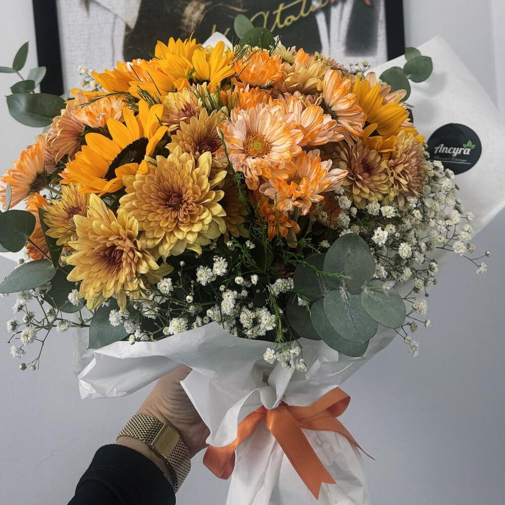 okaliptus - 5 adet ayçiçeği - 5 adet cipsofilya - 5 adet turuncu kasımpatı - 20 adet somon kasımpatı - 20 adet