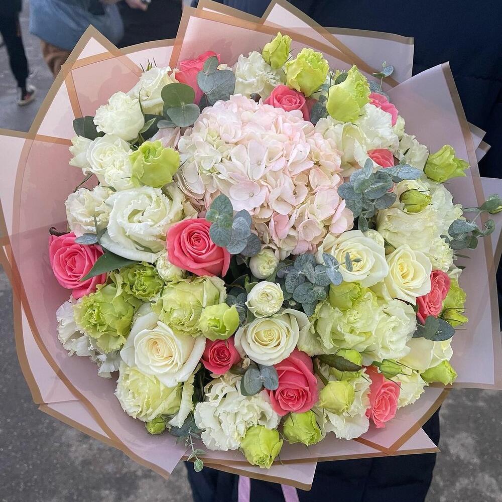 Eucalyptus - 10 adet Pink rose - 10 adet White rose - 5 adet white eustoma - 10 adet green eustoma - 10 adet
