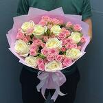 Beyaz taze güller ve pembe çardak güllerin birleşimden oluşan şık buket.kalite ve güvenilirliği garanti ediyoruz