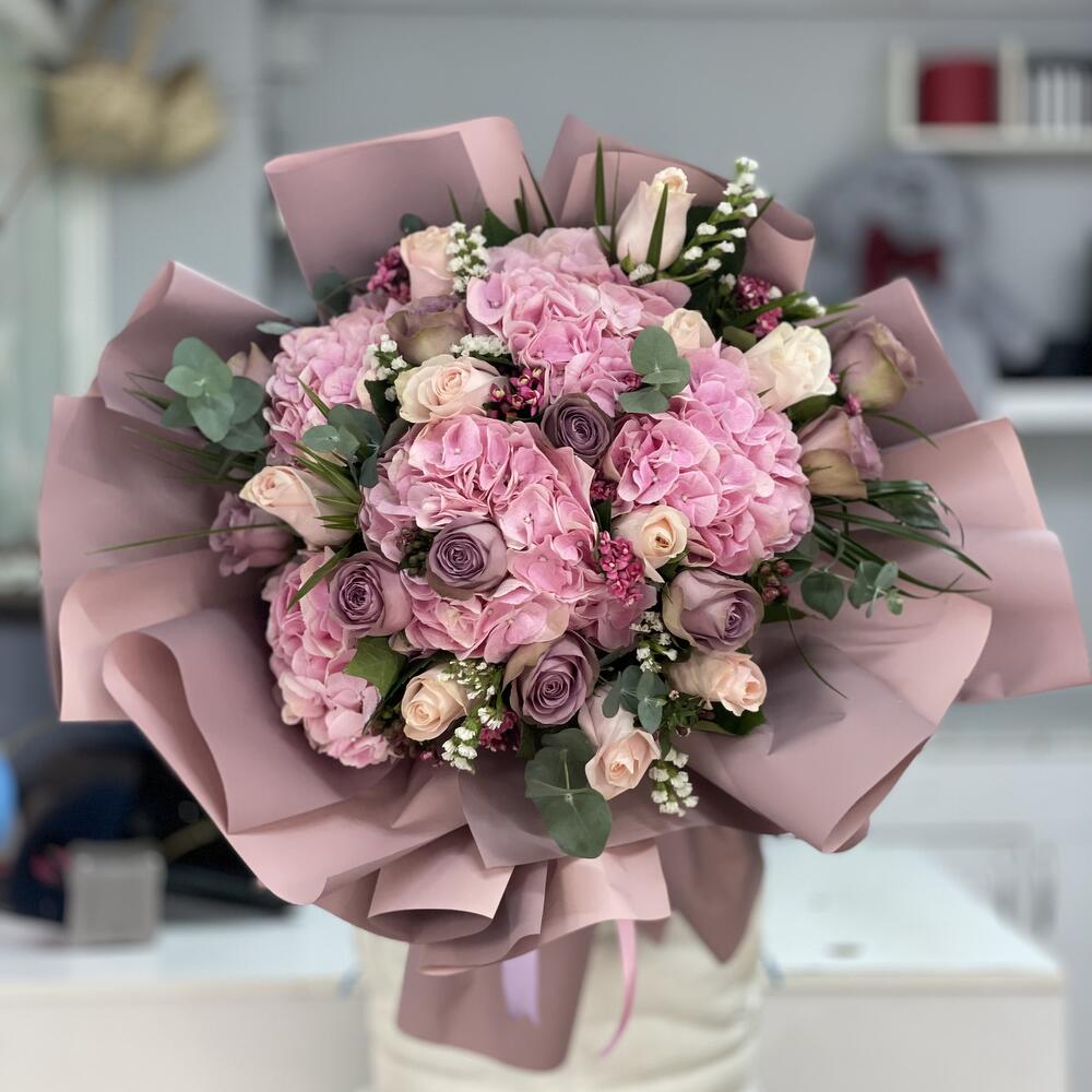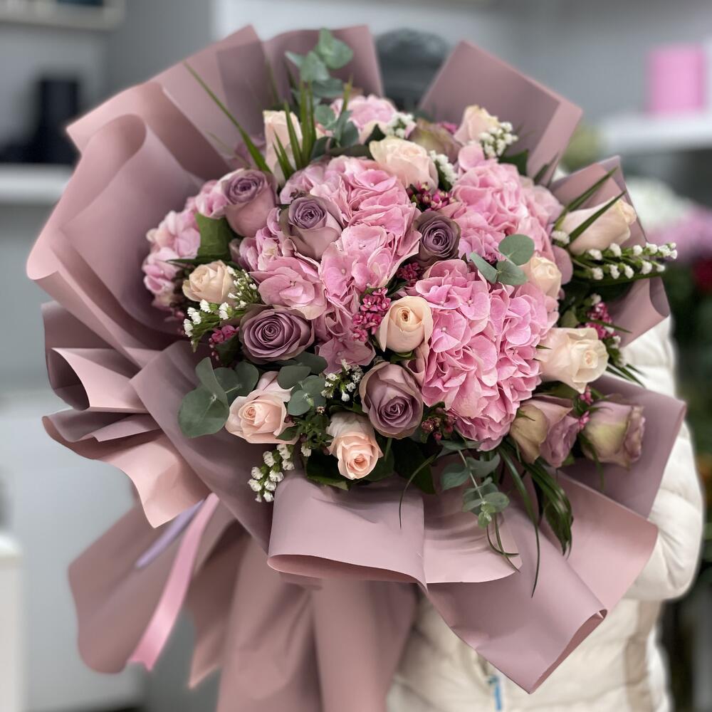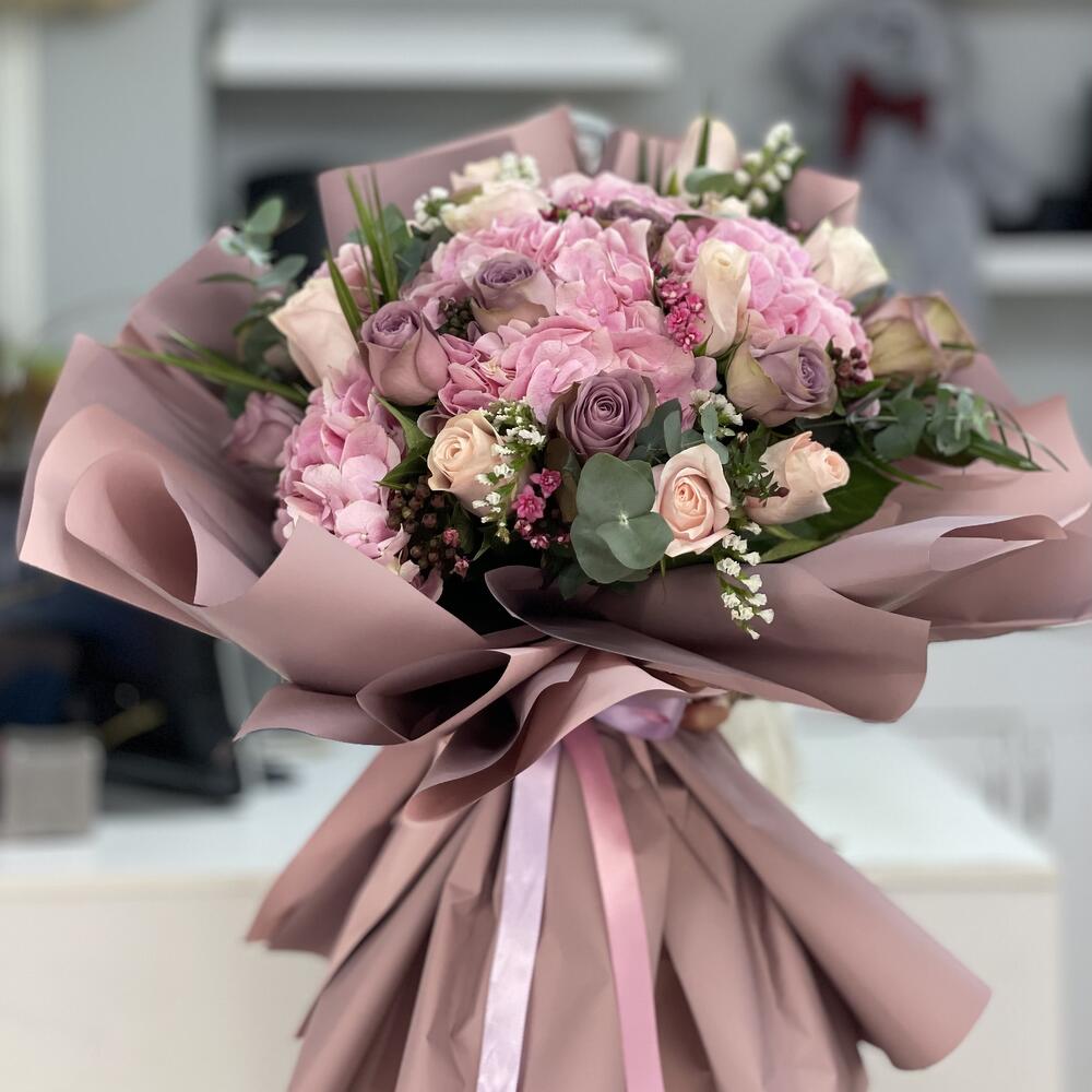 Bu ürün, zarif bir sunumla birleştirilmiş çiçeklerin eşsiz bir kombinasyonudur. Pembe ortanca, 5 adetle buketimize renk katan ana çiçektir. Lila ve somon güller, toplamda 20 adet ile buketin hacmini artırıyor. 25 adet yeşillik ve cipso ise bu çiçek kompozisyonuna doğal güzellik ve tazelik katıyor. Bu özel çiçek buketi, sevdiklerinizin özel günlerini daha da anlamlı kılmak için mükemmel bir seçim olacaktır.