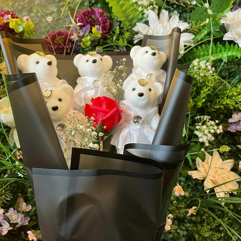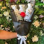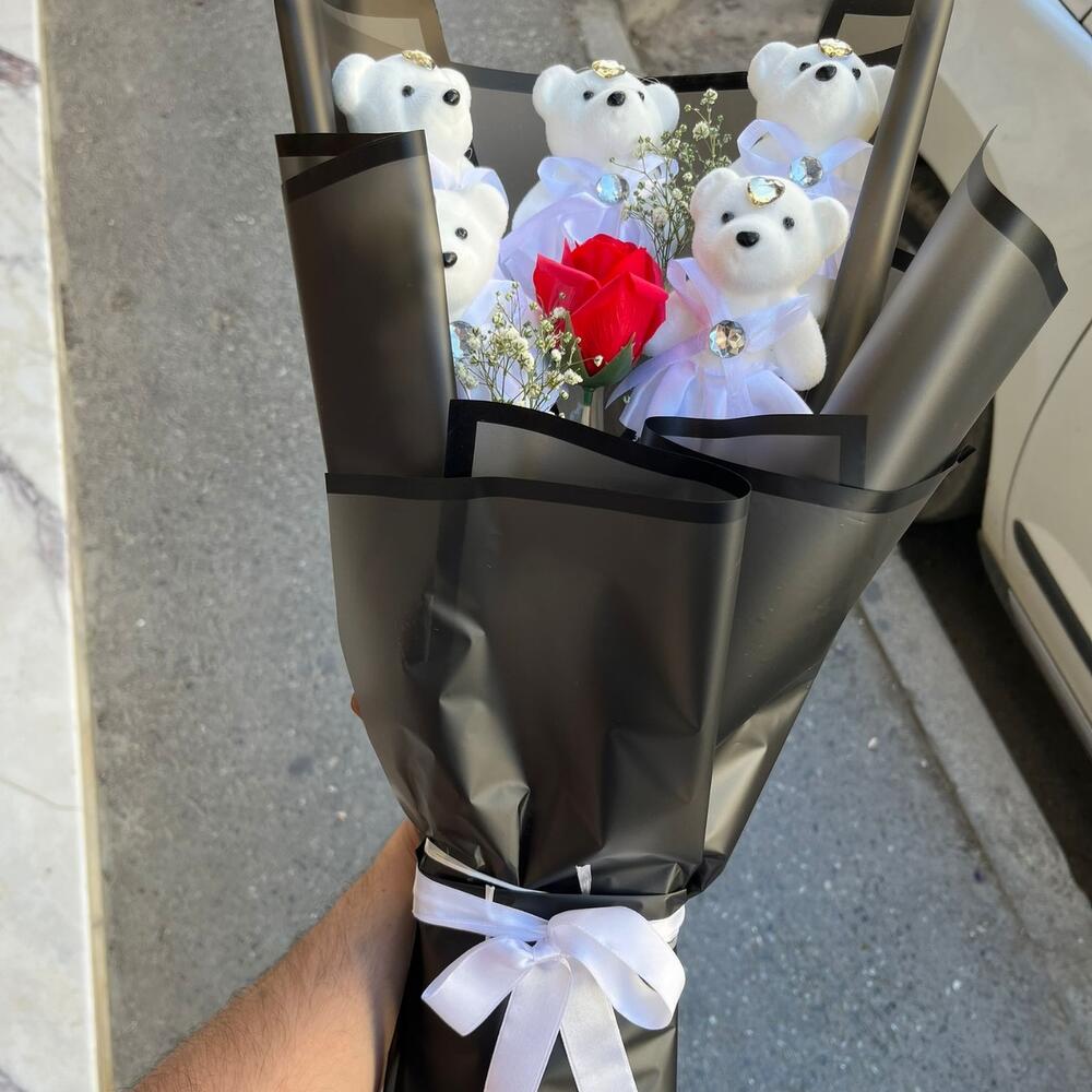 ORTA BOY KIRMIZI GÜLLÜ BEYAZ AYICIK BUKETİ