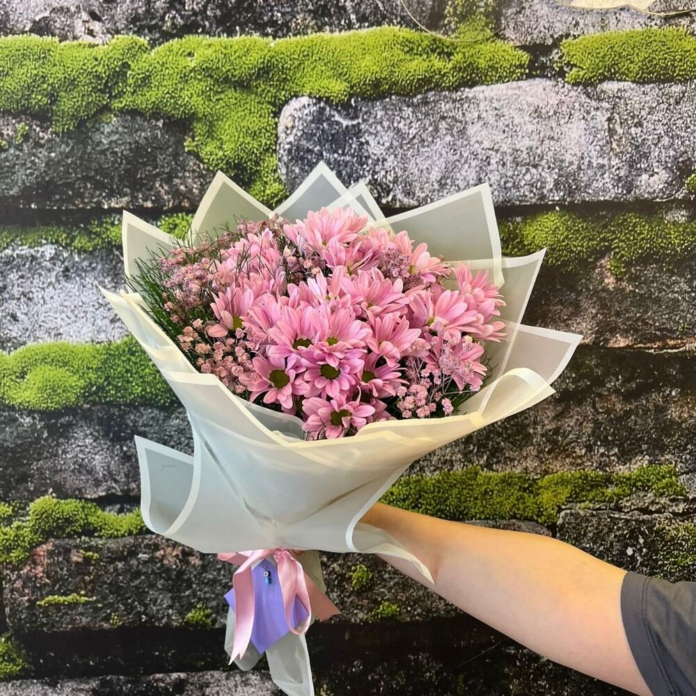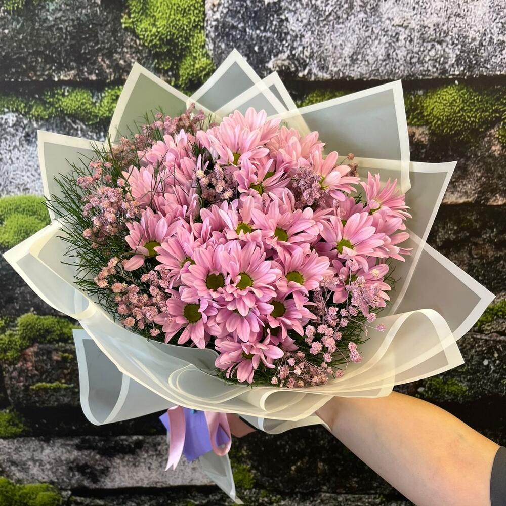 Beyaz şeffaf kağıda sarılmış bu zarif orta boy buket; pembe papatyalar ve pembe cipsoların romantik uyumuyla hazırlanmıştır. 💕🌿 Yumuşak tonlarıyla sade ama etkileyici bir görünüm sunar. Doğum günü, sevgililer günü veya özel kutlamalarda sevdiklerinize zarif bir mutluluk armağan edin. 🌸✨