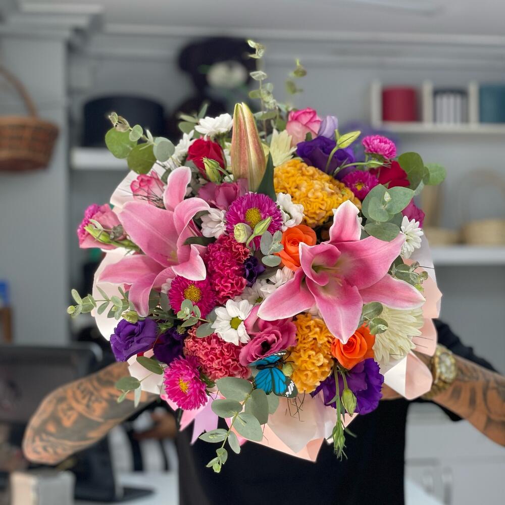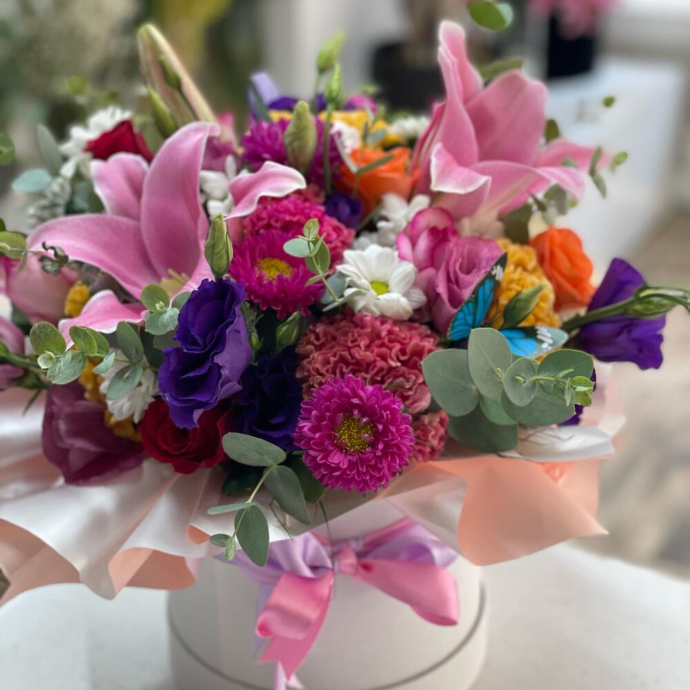 Bu özel kutuda; 3 adet zarif lilyum, 14 adet parlak papatya, 6 adet romantik gül ve 5 adet ferah okaliptüs bulunmaktadır. Zengin ve renkli bir kompozisyon oluşturan bu çiçekler, estetik bir kutuda zarifçe düzenlenmiştir. Hem sevdiklerinize hem de yaşam alanlarınıza taze ve canlı bir dokunuş katmak için mükemmel bir seçim. Kendinizi veya sevdiklerinizi bu özel ve şık çiçek kutusu ile şımartın.