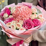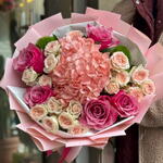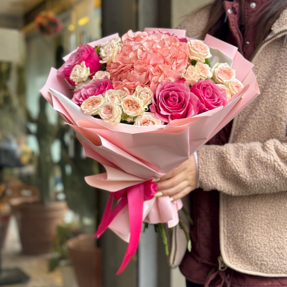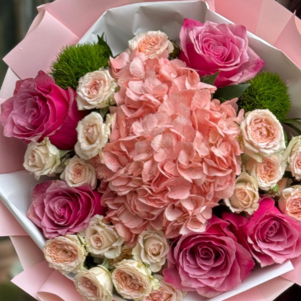 Merkezinde yer alan zarif pembe ortanca ve etrafını saran pembe, fuşya ve şampanya tonlarındaki güllerle hazırlanmış şık ve dolgun bir bukettir. Modern pembe ambalaj ve kurdele detayıyla sunulur. Doğum günü, yıldönümü, romantik sürprizler ve özel anlar için ideal bir tercihtir. El buketi formundadır ve fotoğraftaki stile uygun şekilde hazırlanır.