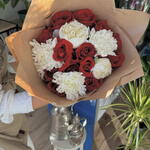 kırmızı gül - 13 adet ambalaj - 2 adet beyaz kasımpatı - 5 adet