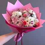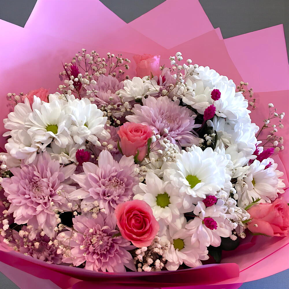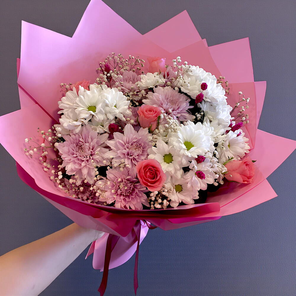 pembe gül - 5 adet beyaz papatya - 3 adet pembe papatya - 2 adet cipso ve yesillikler - 10 adet