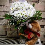 Beyaz Papatya ve Ayıcık, Tek Kırmızı Gül Saflığın simgesi beyaz papatyalar, sevimli bir peluş ayıcık ve aşkı temsil eden tek kırmızı gül ile hazırlanmış özel aranjman. Hem romantik hem de sıcacık bir hediye.
