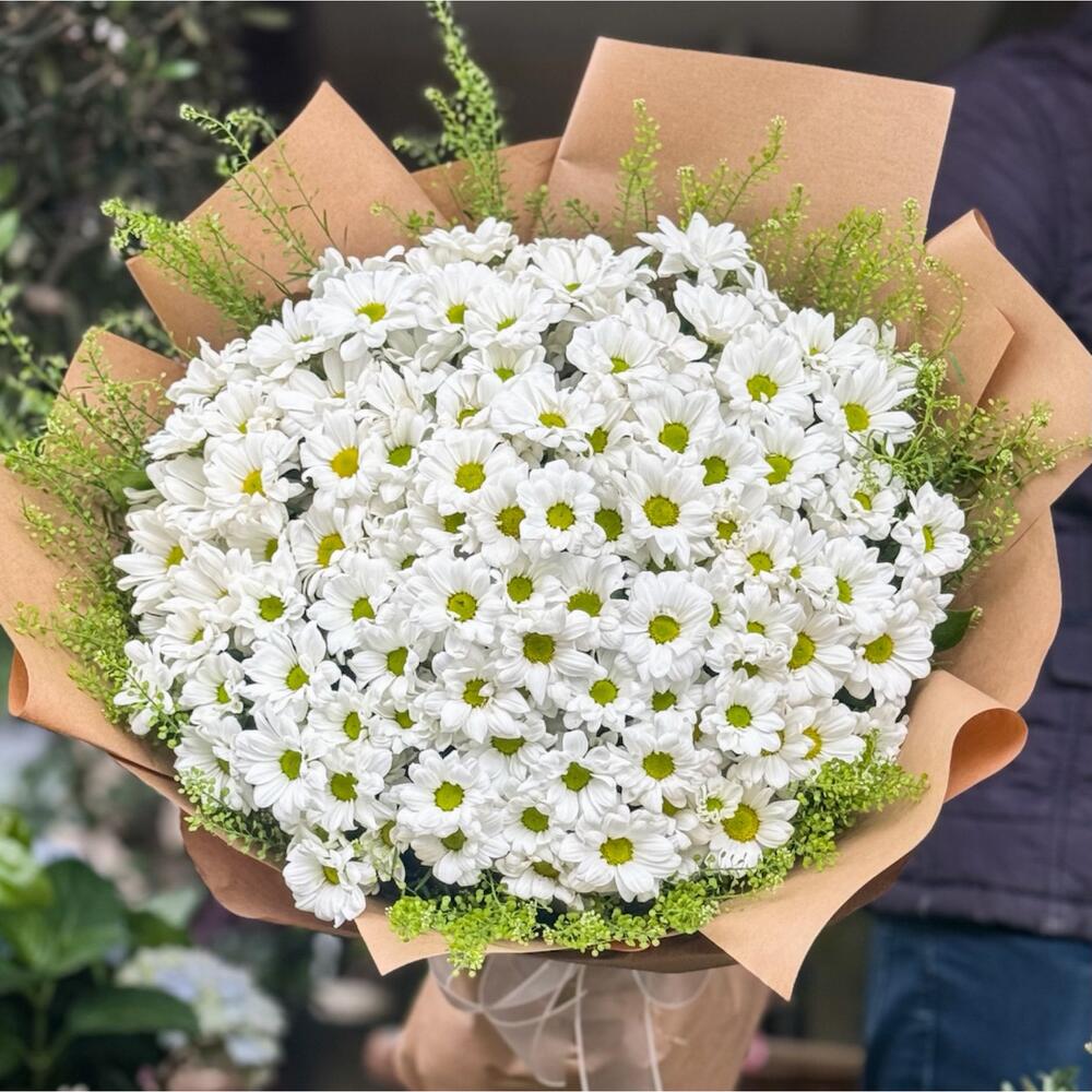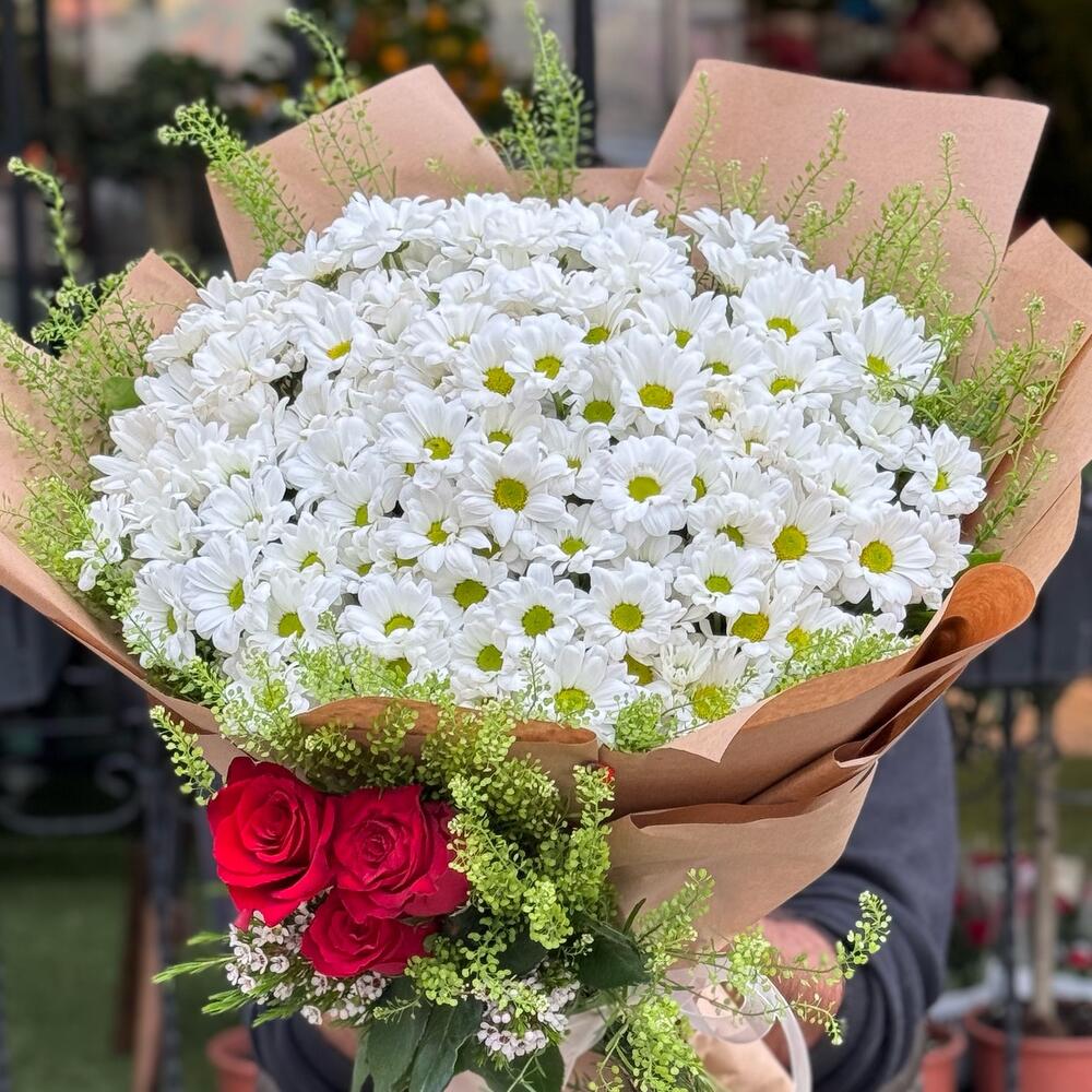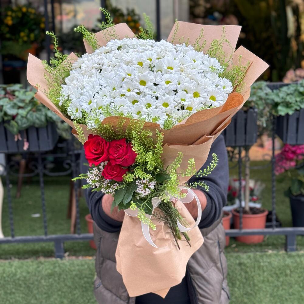 Sadeliğin simgesi beyaz crisantemler naturel Kraft ambalaj kağıdıyla paketlenerek aşkın sembolü kırmızı güllerle çok daha etkileyici ve sevdiklerinizi şımartacak aynı zamanda sevindirip mutlu edecek kucak dolusu çiçek buketi