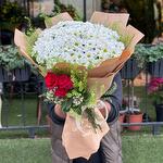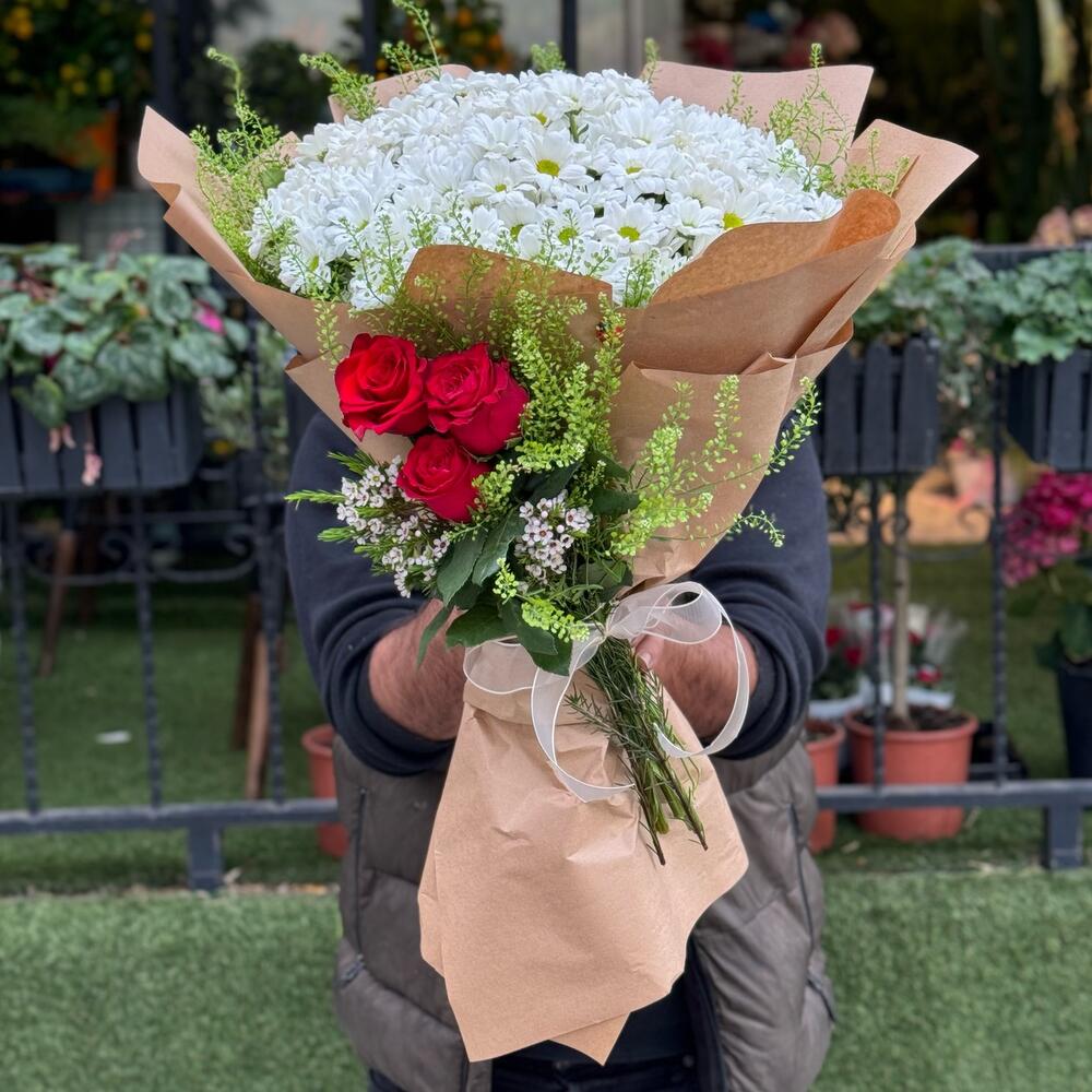 kırmızı gül - 3 adet beyaz crisantem - 20 adet