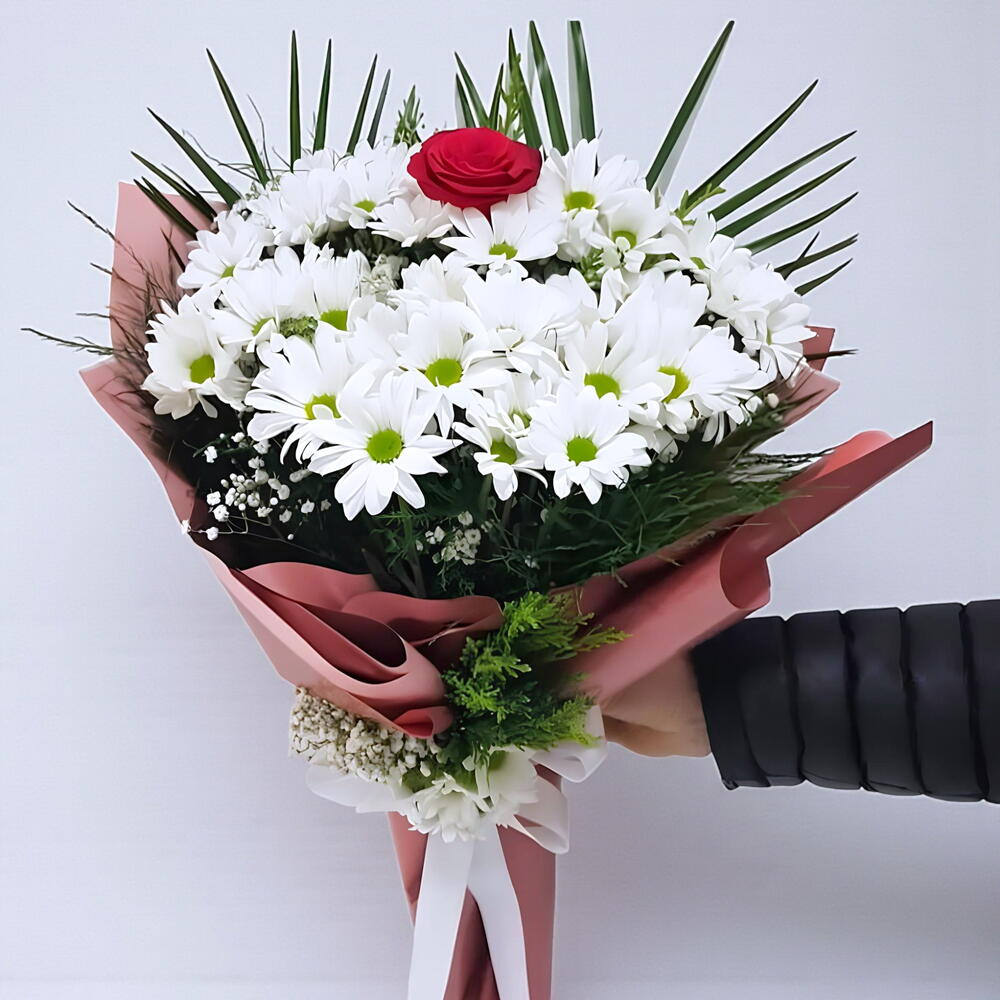Bu klasik ve çarpıcı çiçek buketi, sevdiklerinizi etkilemek için ideal bir hediye. Altı adet narin papatya, tek bir parlak kırmızı gül ve iki Phonex yaprağı, özenle seçilmiştir ve çarpıcı bir görsel çiçek deneyimi sunar. İçerisindeki on adet Cipsofilya ile buket, çok daha etkileyici ve büyülü bir hava katıyor. Bu büyüleyici çiçek buketi, herhangi bir özel anı kutlamak veya sadece sevdiklerinize ne kadar önem verdiğinizi göstermek için mükemmeldir.