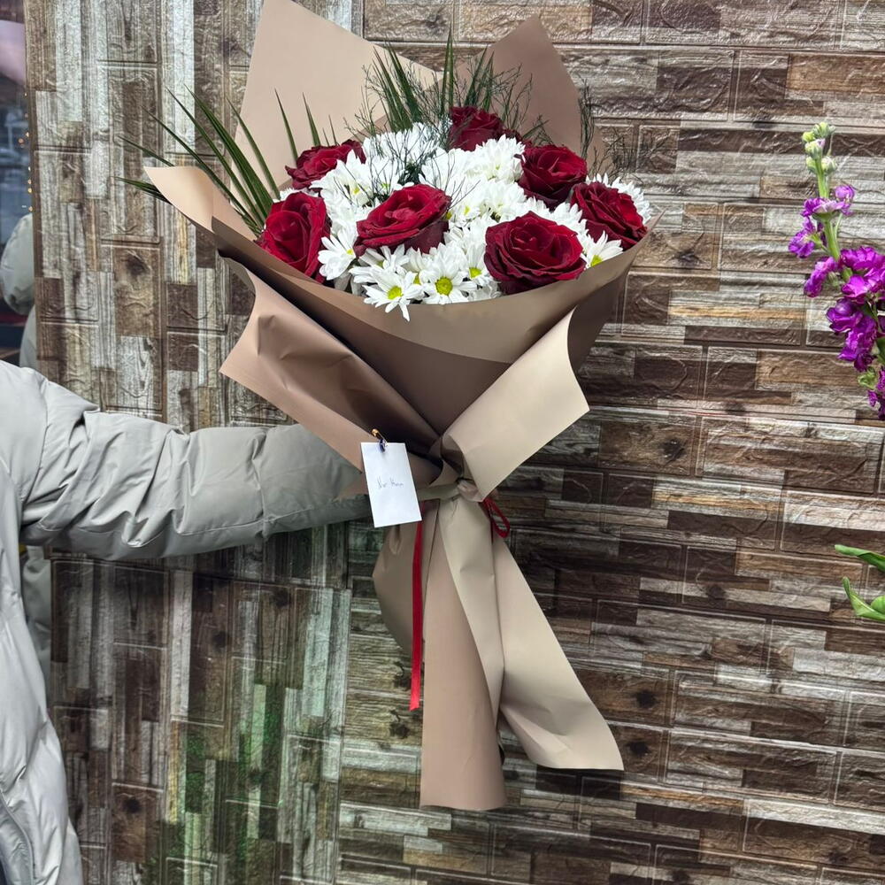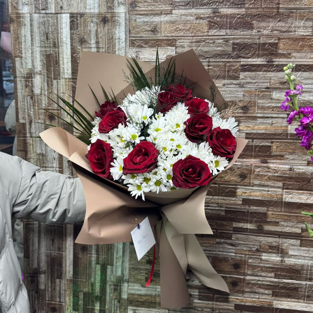 Bu büyüleyici çiçek buketi, 10 adet kırmızı gül ve 10 adet beyaz papatya ile süslenmiştir. Kırmızı güller aşkı ve tutkuyu, beyaz papatyalar ise masumiyeti ve saflığı simgeler. Bu çiçek buketi, sevdiklerinize olan duygularınızı mükemmel bir şekilde ifade edecektir. Her bir çiçek titizlikle seçilmiş ve bu muhteşem buketi oluşturmak için harmanlanmıştır.