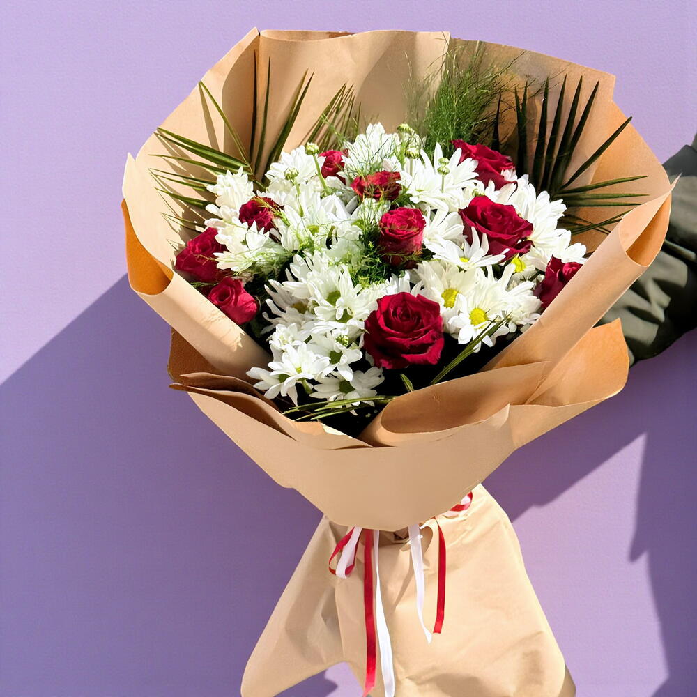 Büyüleyici bir çiçek kompozisyonu, bu özel çiçek buketi, 11 adet romantik gül, 9 yeşillik ve 5 adet sevimli papatya ile dikkatlice hazırlanmıştır. Bu çiçekli şölen, sevdiklerinize ne kadar değer verdiğinizi göstermek için ideal bir yoldur. Her bir çiçek, onları alan kişiye dans eden renkler ve canlı enerji sağlamak için titizlikle seçilmiştir. Bu çiçek buketini sunarak, her durumun özellikle önemli ve unutulmaz olduğunu gösterin.