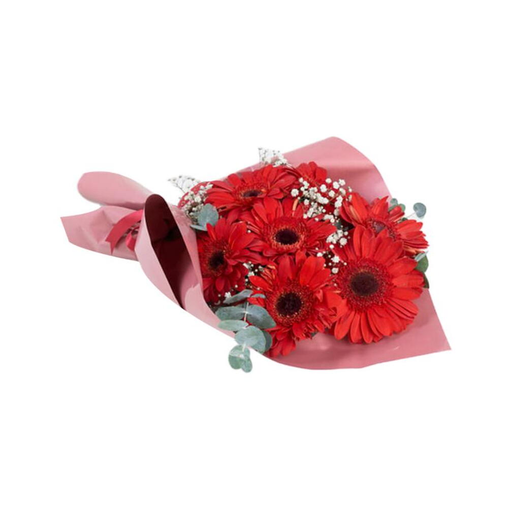Pembe Ambalaj Kağıdında Kırmızı Gerbera Buketi