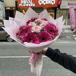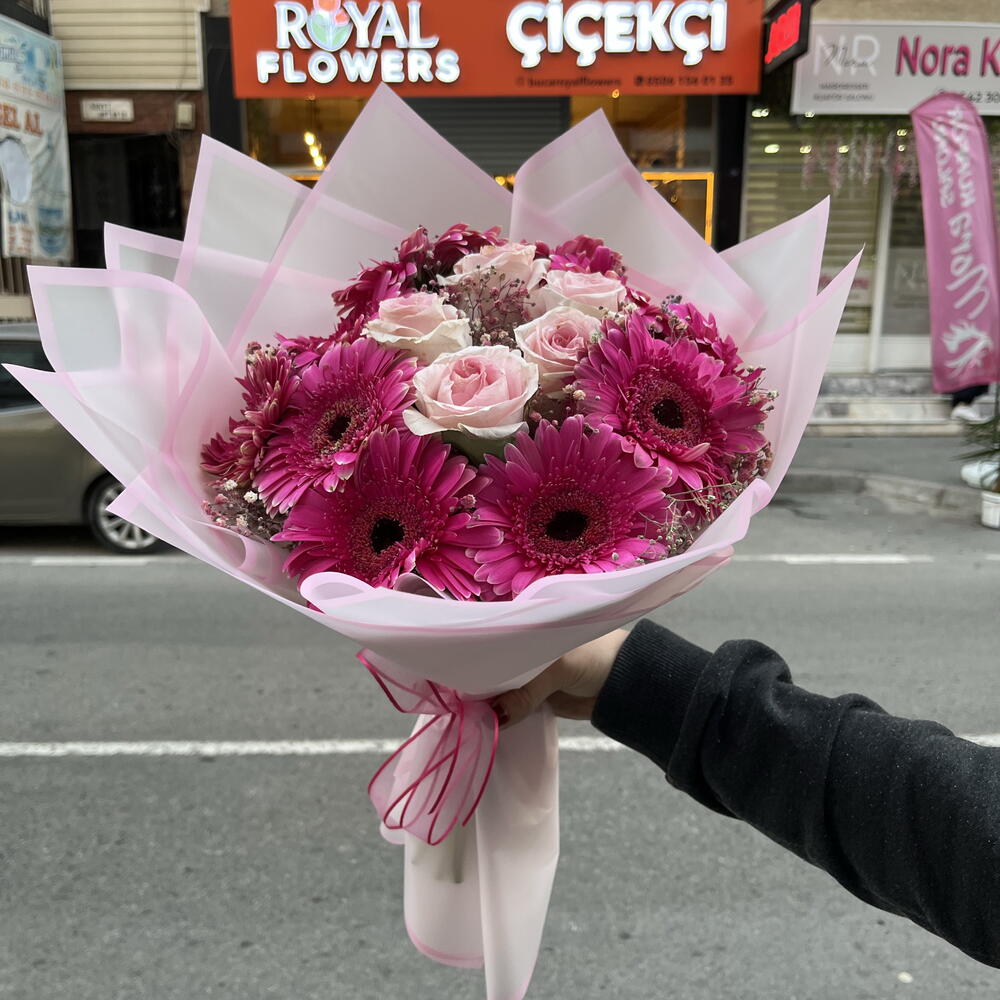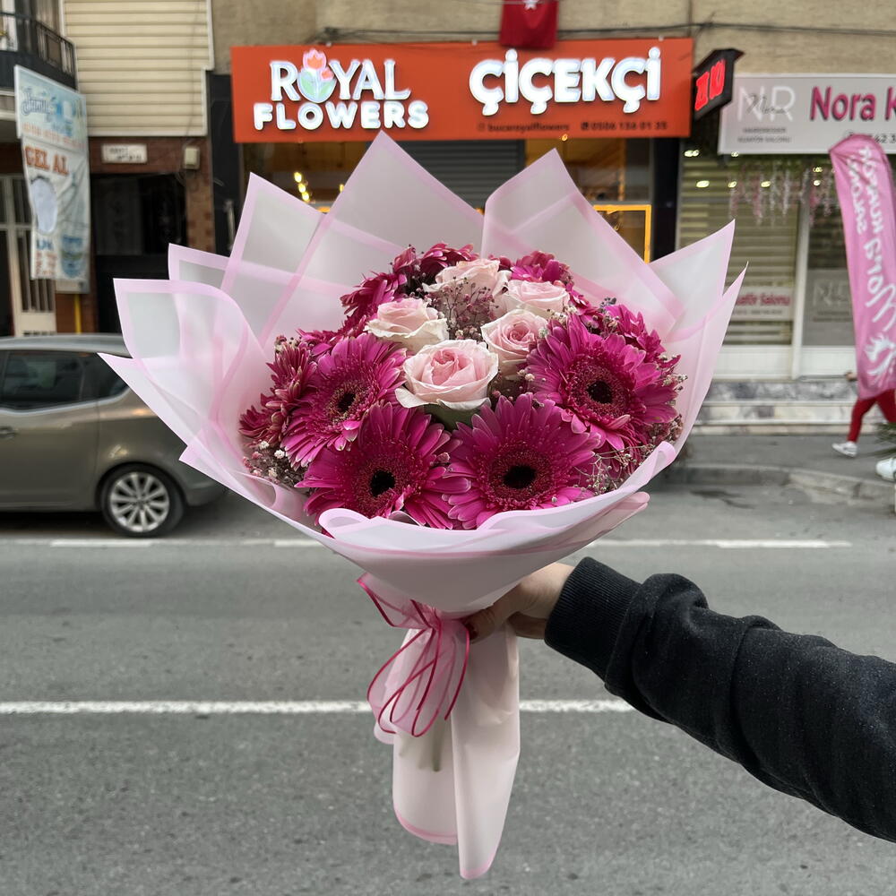 pembe gül - 5 adet pembe cipso - 20 adet fuşya gerbera - 10 adet