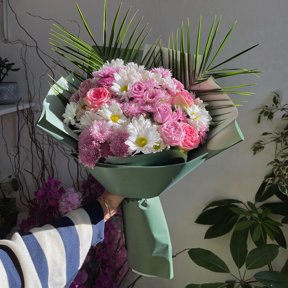 Renkli ve zarif görünümüyle bulunduğu ortamı anında canlandıran bu karışık çiçek buketi; pembe tonların sıcaklığını, beyaz çiçeklerin saflığını ve yeşil yaprakların ferahlatıcı enerjisini bir araya getirir. Modern yeşil ambalajı ve şık sunumuyla hem ev hem de ofis için göz alıcı bir dekor niteliğindedir. Özel gün kutlamalarından gündelik jestlere kadar her anı güzelleştirecek duygulu ve estetik bir hediye seçeneğidir. ⸻ 🌸 Ürün İçeriği • Beyaz papatyalar • Pembe gül • Pembe kasımpatı • Modern yeşil ambalaj şık kurdele • Özenli paketleme ⸻ 🎁 Gönderim İçin İdeal: • Doğum günü • Yeni iş terfi • Tebrik kutlama • Anneler günü • Geçmiş olsun • Sürpriz ve özel günler • Sevgiliye / eşe zarif bir jest ⸻ 🌿 Bakım Önerileri • Vazo suyu 2–3 günde bir yenilenmelidir. • Su seviyesini sapların alt kısmını tamamen kapatacak şekilde ayarlayın. • Çiçekleri direkt güneş almayan, serin ve aydınlık bir ortama koyun. • Sapların uçlarını 2 günde bir 1 cm kadar keserek tazeliğini koruyabilirsiniz. ⸻ 🔍 META AÇIKLAMASI Metalik yeşil ambalajlı karışık çiçek buketi; pembe ve beyaz tonların buluştuğu şık, zarif ve iç açıcı bir hediye seçeneği. Özel günler ve tebrik gönderimleri için ideal taze çiçek aranjmanı.