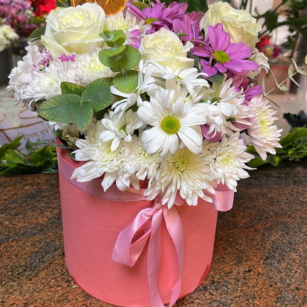Zarif pembe kutuda hazırlanan bu özel aranjman; beyaz güller, pembe krizantemler, papatyalar ve eucalypthus yapraklarıyla romantik bir uyum yakalar. 🍃🌷 Üzerindeki kuru portakal dilimleriyle naturel bir dokunuş kazanan bu tasarım, doğallığı ve şıklığı bir arada sunar. 💕 Sevdiklerinize özel günlerde hediye edebileceğiniz bu aranjman, hem papatya aranjmanı hem de gül kutu çiçek kategorisinde öne çıkar. 🌿🎀