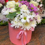krizantem - 5 adet papatya - 5 adet beyaz gül - 3 adet okaliptus - 7 adet pembe papatya - 6 adet pembe hüsnü - 4 adet