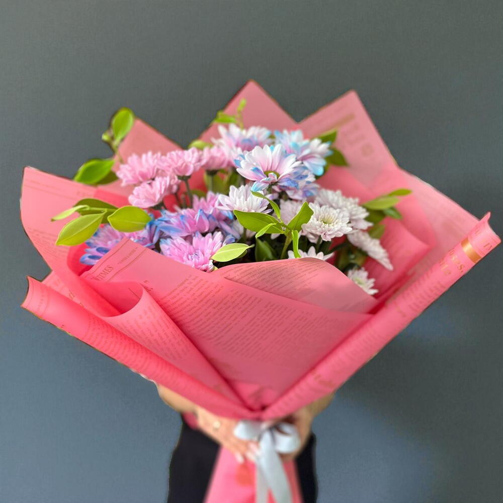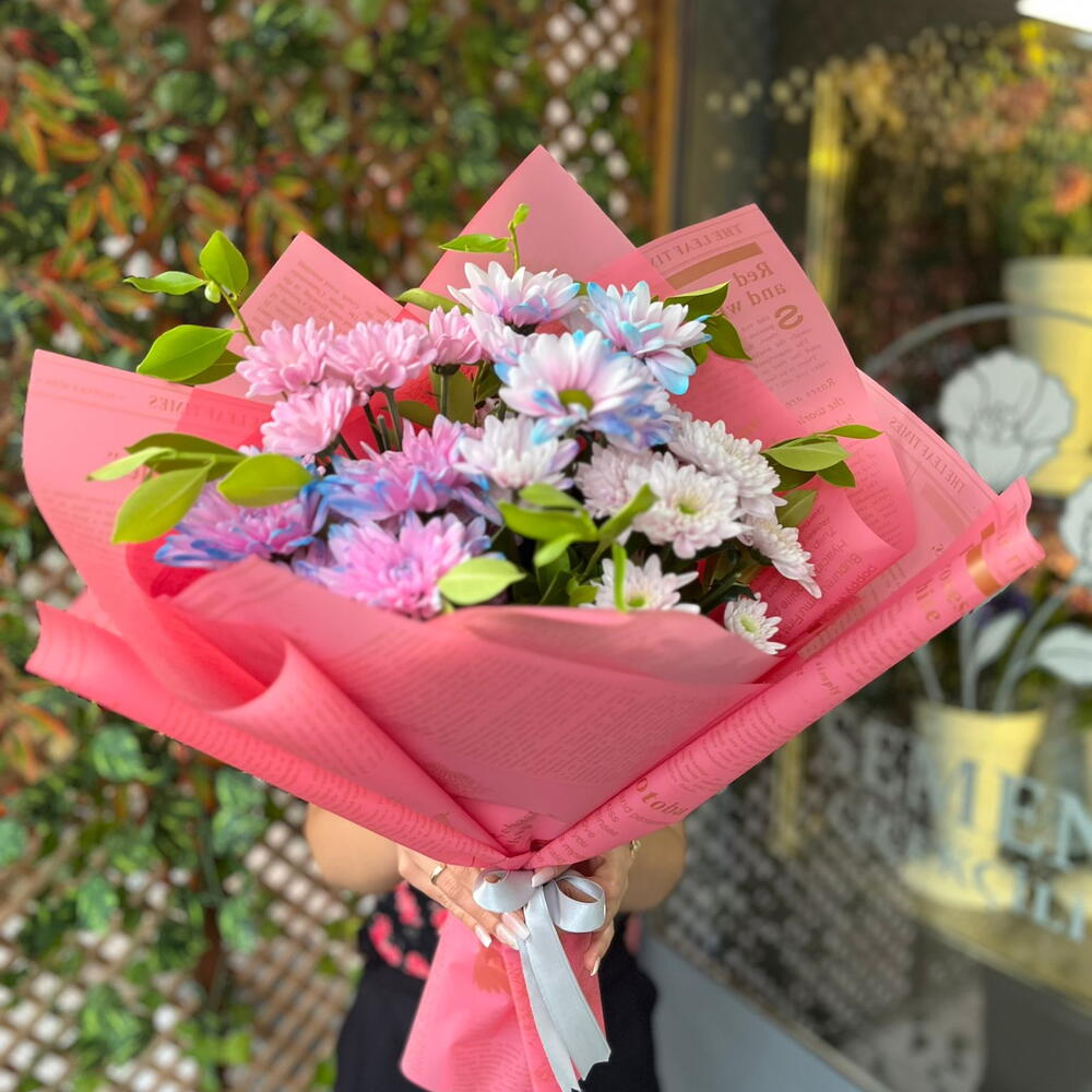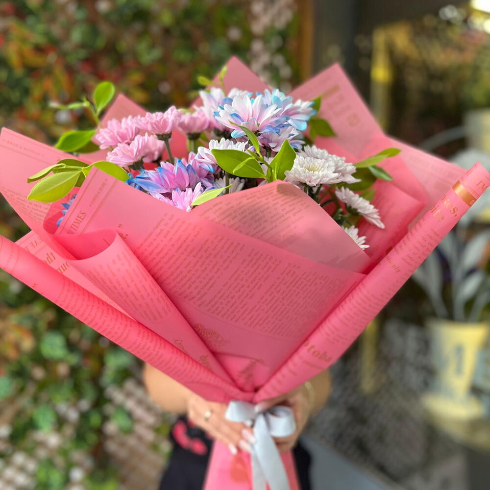 Bu eşsiz çiçek buketi, pembeye dönük 5 adetten oluşan kasımpatılar, mavi-pembe tonlarındaki 5 kasımpatı, 6 adet pembe papatya ve 5 adet pembe-mavi papatyayla süslendi. Tüm bu güzellikler, etraflarını saran 6 yeşillik takviyesi ve üç kat buket kağıdıyla mükemmel bir uyum içerisinde. Sevdiklerinize, bu zarif ve göz alıcı buket ile duygularınızı en özel şekilde ifade edin.