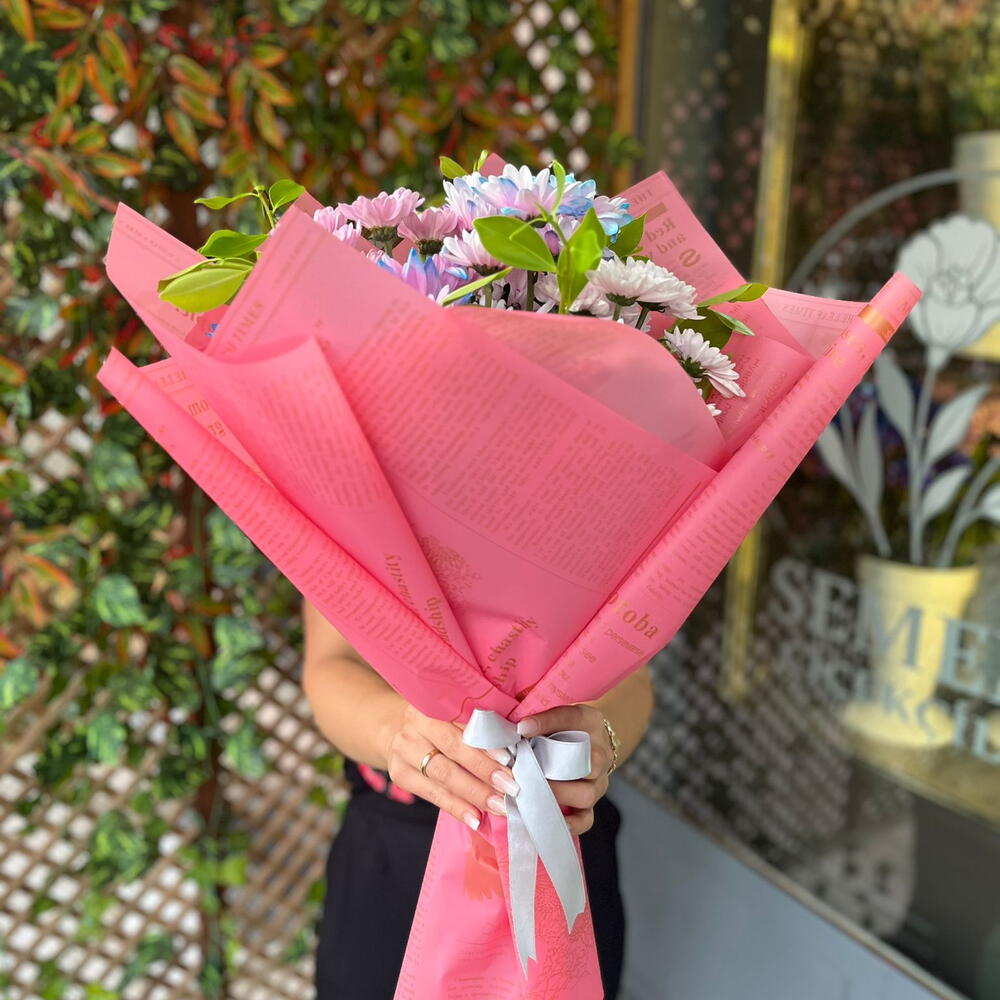 buket kağıdı - 3 adet pembe papatya - 6 adet yeşillik - 6 adet kasımpatı pembe - 5 adet kasımpatı mavi pembe - 5 adet papatya pembe mavi - 5 adet