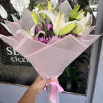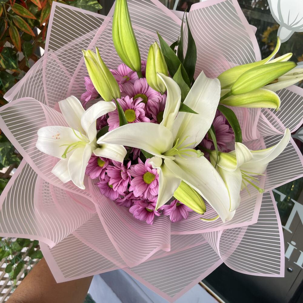 buket kağıdı - 4 adet pembe papatya - 20 adet kazablanka lilyum - 3 adet