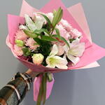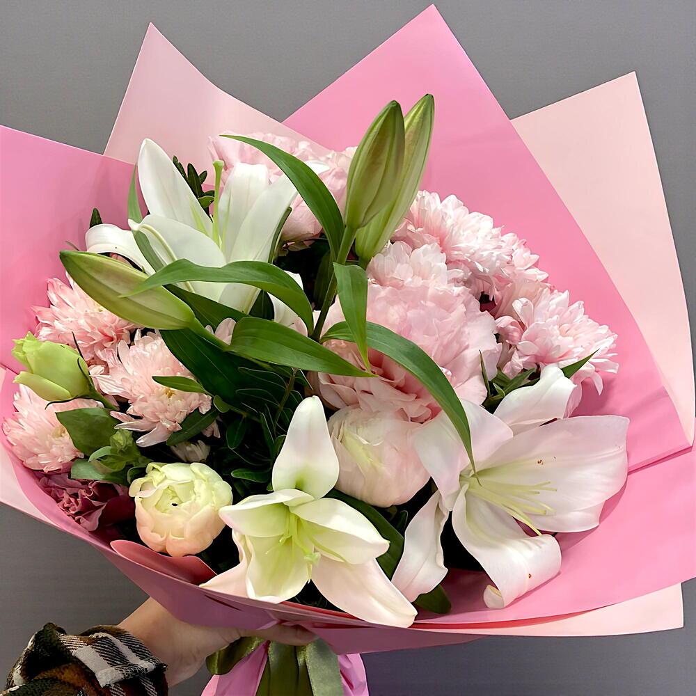 Bu zarif çiçek buketi, 12 adet pembe papatya, 5 adet beyaz lilyum kandili ve 6 adet pembe lisyantus ile tasarlanmıştır. Her bir çiçeğin özenli seçimi, buketin genel görünümüne ve çekiciliğine katkıda bulunur. Kendinizi veya sevdiklerinizi bu sofistike ve şık çiçek kompozisyonu ile şımartın. Göz alıcı renkleri ve taze kokusuyla, bu çiçek buketi her özel anı daha da unutulmaz kılacaktır.
