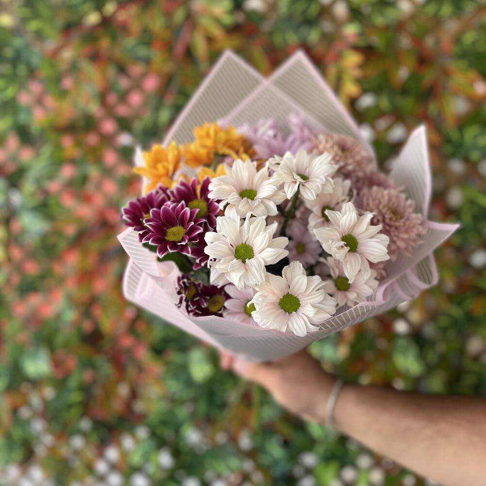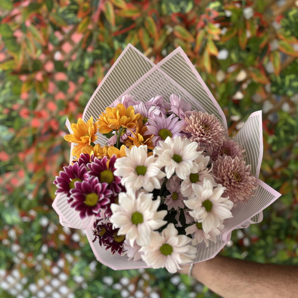 Bu çarpıcı Karışık Buket, yaşamınıza renk katacak bir karışım sunuyor. Buketimiz, 8 adet turuncu papatya, 5 adet pembe kasımpatı, 6 adet beyaz papatya, 8 adet pembe ve yeşil papatya, 6 adet mor papatya ve 3 adet Bükten oluşmaktadır. Her bir çiçek, taze ve canlılığını uzun süre koruyacak şekilde özenle seçilmiştir. Bu zarif ve neşe veren buket, sevdiklerinize ne kadar değerli olduğunu göstermek veya evinizi şenlendirmek için mükemmel bir seçenektir. Kendinize veya sevdiklerinize bu doğa harikasından bir parça hediye edin.