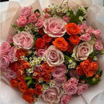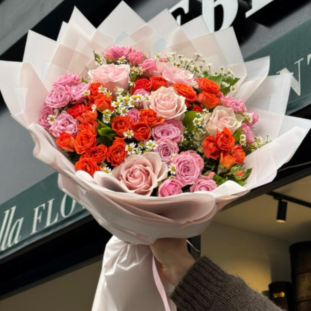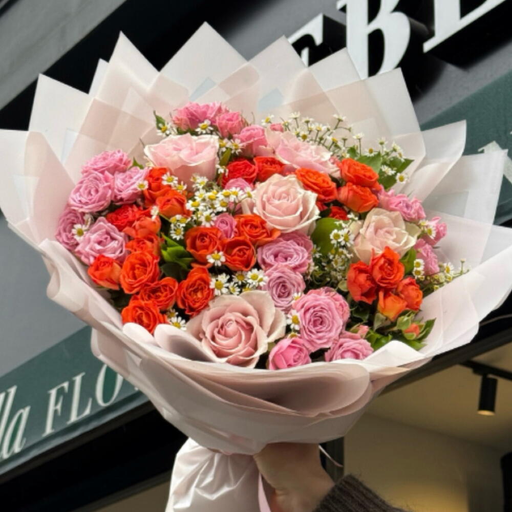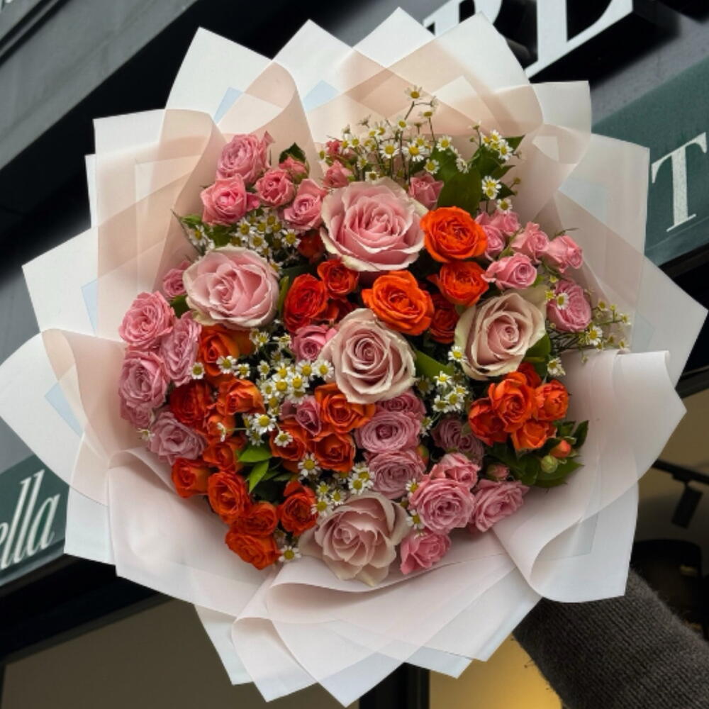 5 adet pembe gül, 20 adet turuncu çardak gül ve 5 adet pembe çardak gül ile hazırlanan bu şık buket, zarif bir tasarıma sahip. 20 adet yeşillik ve 5 adet papatya ile zenginleştirilmiş, 30 cm genişliğinde ve 40 cm yüksekliğinde. Hem günlük hem de özel günlerde sevdiklerinizi mutlu etmeye yetecek.
