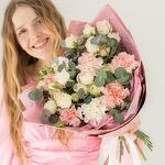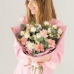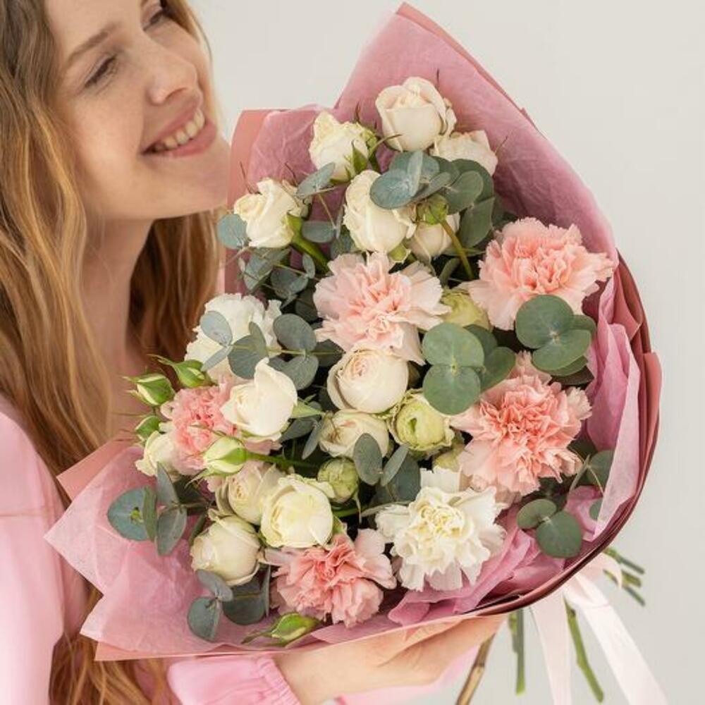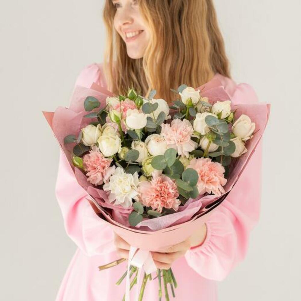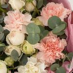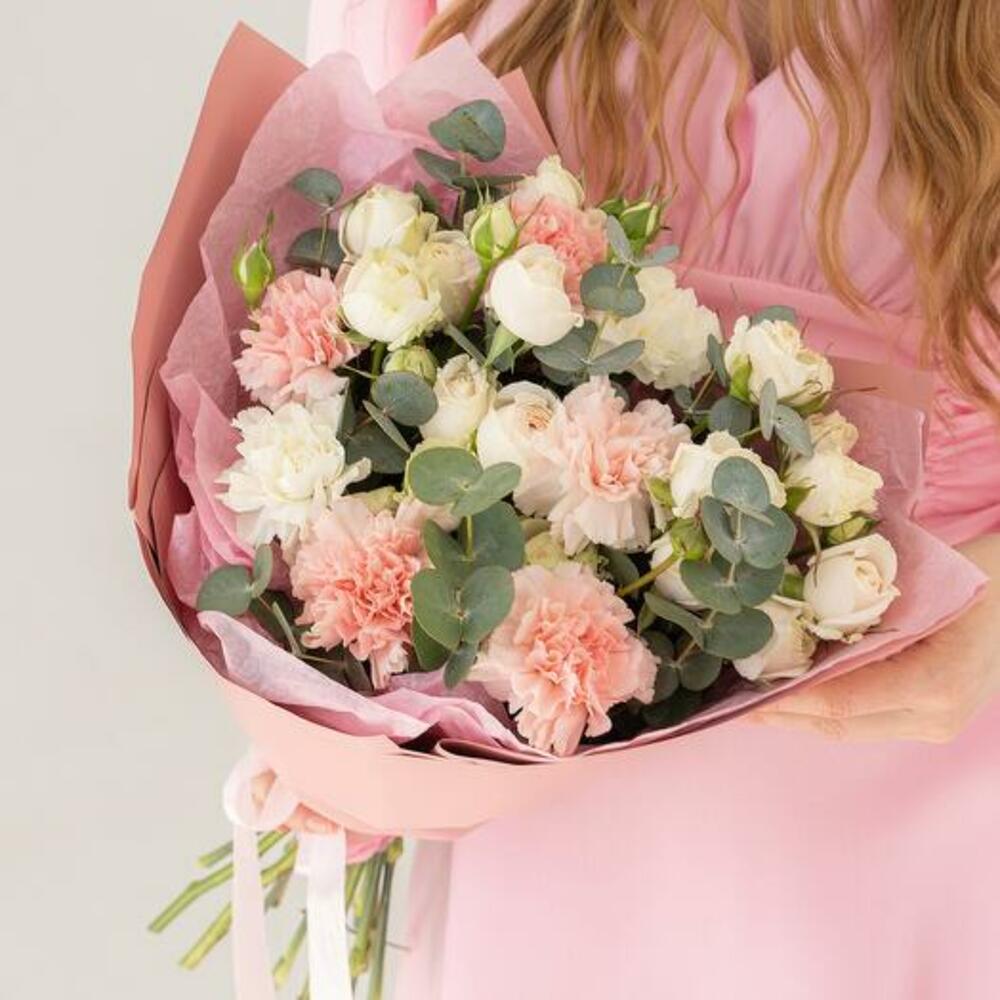 Buketimizin narin güzelliğini kucaklayın. Bu çarpıcı aranjmanda yumuşak pembe karanfiller, kremsi beyaz güller ve zarif okaliptüslerin hoş bir karışımı yer alıyor. Her bir çiçek, renk ve dokuların uyumlu bir karışımını oluşturmak için özenle seçilmiş ve doğal güzelliklerini artıran şık pembe bir kağıda sarılmıştır. Doğum günleri, yıldönümleri veya herhangi bir özel gün için mükemmel olan bu buket, cazibesini ve sofistikeliğini yansıtarak unutulmaz ve içten bir hediye olmasını sağlar.