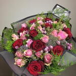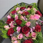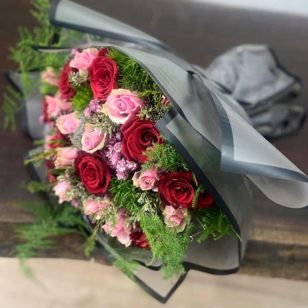 Bu zarif buket, aşkı ve romantizmi en güzel şekilde ifade eden kırmızı ve pembe güllerin uyumuyla göz kamaştırıyor. Kırmızı güllerin derin anlamı ve pembe güllerin zarafeti, bukete duygusal bir derinlik katarken, aster ve statice çiçekleriyle tasarıma sofistike bir dokunuş ekleniyor. Dekoratif yeşilliklerle tamamlanan bu aranjman, sevdiklerinize duygularınızı ifade etmek için mükemmel bir seçenek sunuyor. Buketin tazeliğini koruyabilmesi için doğrudan güneş ışığından uzak tutulmalı, saplar çapraz kesilerek vazo suyu günlük olarak değiştirilmelidir. Özel günlerde unutulmaz bir hediye alternatifi olan bu şık ve romantik buket, sevdiklerinizin kalbini fethedecek.