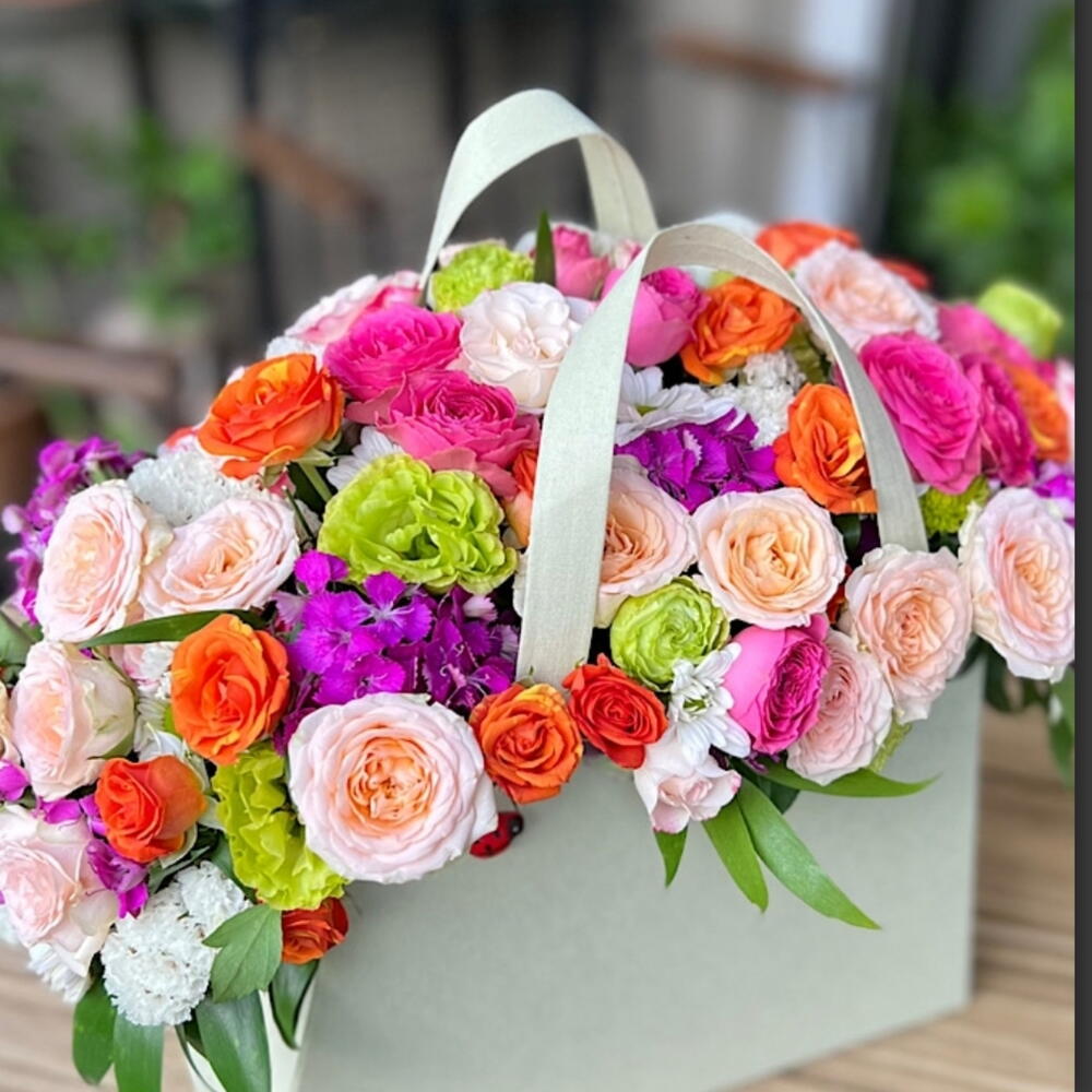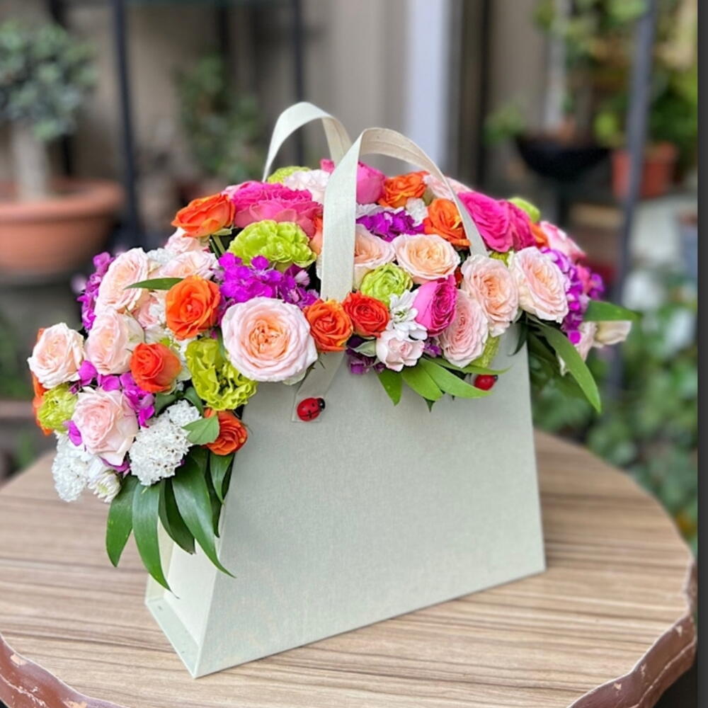 Krem rengi çanta şeklinde karton kutu hanımlar için özel tasarlandı ve içerisindeki rengarenk sprey güller bahçeden toplanmış ve sevdiğinize çanta içinde sunulmuş gibi, Anneler günü için annelerimizin seveceği bu rengarenk tasarım özel olarak tasarlandı