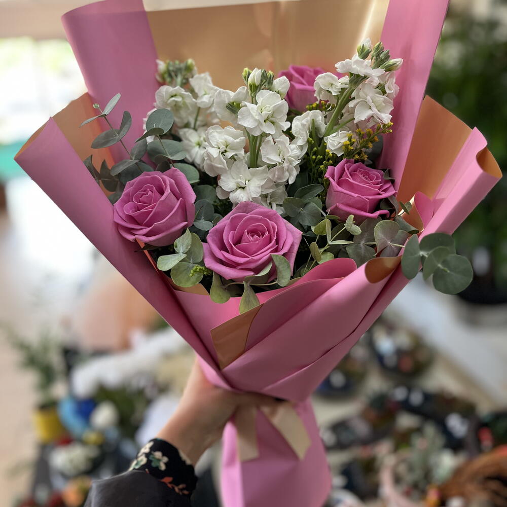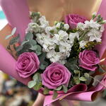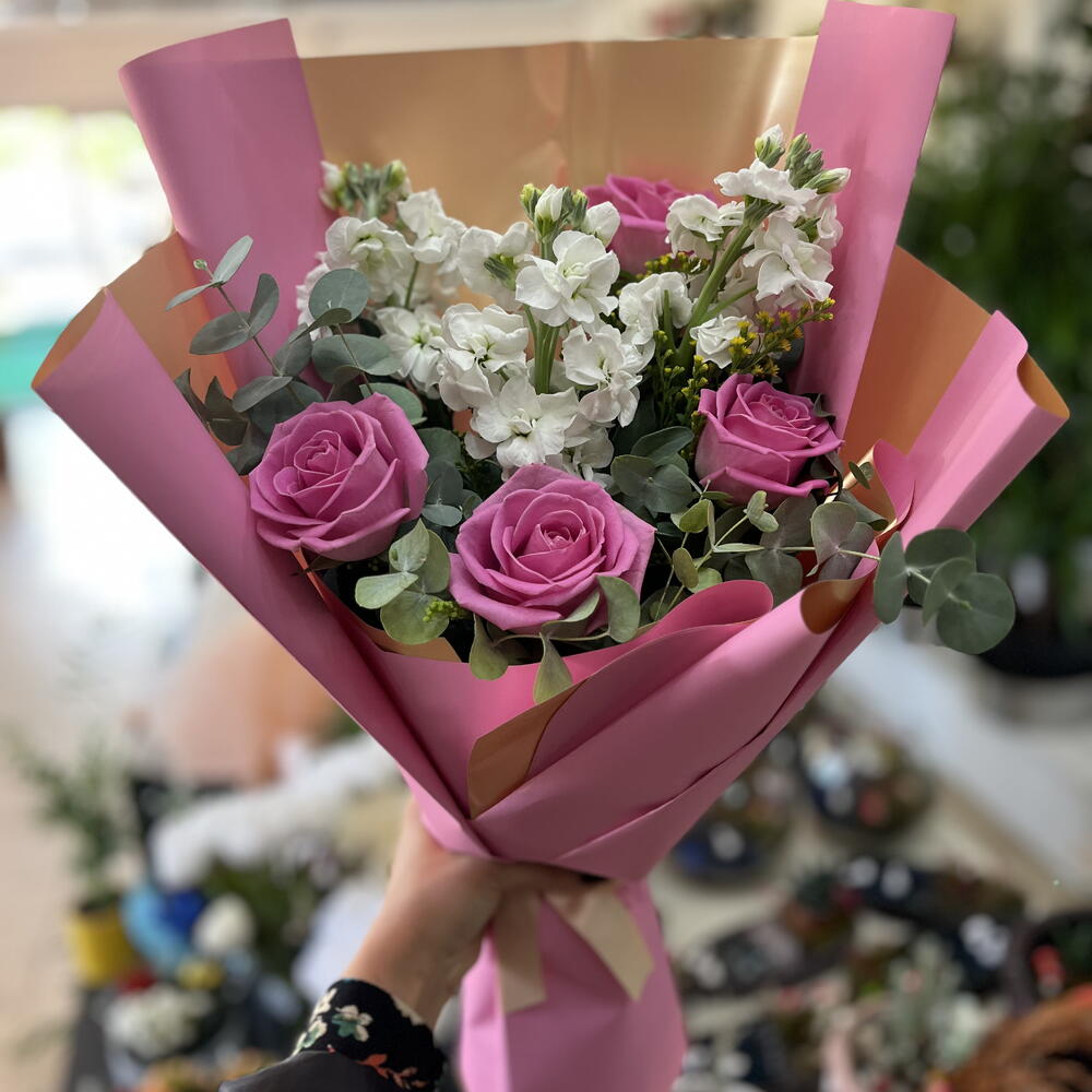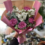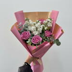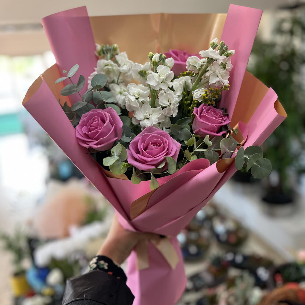Bu zarif buket, lavanta tonlarındaki güllerin romantik güzelliğini beyaz çiçeklerin saflığıyla bir araya getiriyor. Pembe ve altın detaylı ambalajı, modern ve sofistike bir görünüm sunarak bukete özel bir ışıltı katıyor. Her bir çiçek özenle seçilerek zarif bir denge ve tazelik hissi yaratılmıştır. Sevgililer Günü, doğum günü ya da özel kutlamalar için mükemmel bir hediyedir. Buketin yumuşak renk paleti huzur, sevgi ve nezaket duygularını yansıtır. Bu çiçek aranjmanı, zarafetiyle kalpleri fethedecek unutulmaz bir hediye seçeneğidir.